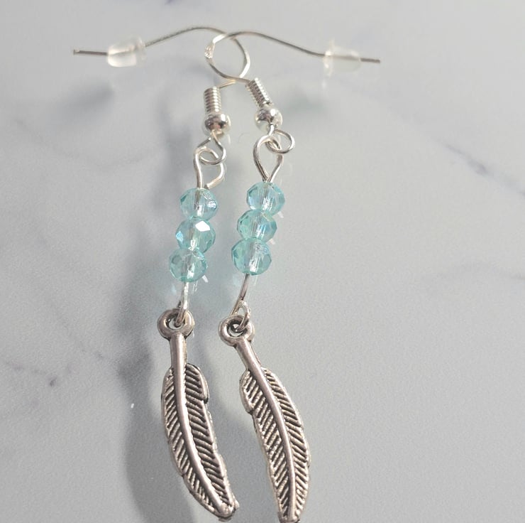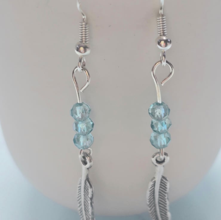 The earrings have been made using 3 light blue faceted glass beads and a silver metal feather charm that dangles down from the bottom of the earrings. The feathes are 21x5.5mm