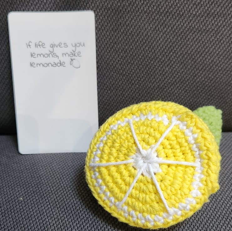 A cute amigurumi lemon hand made in cotton yarn . It measures approximately 8cm across. Stuffing is polyester toy wadding.