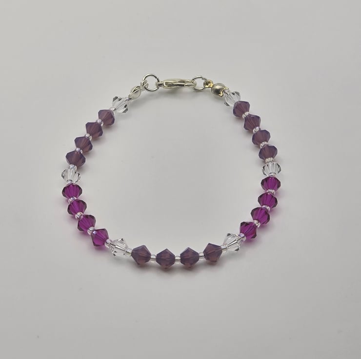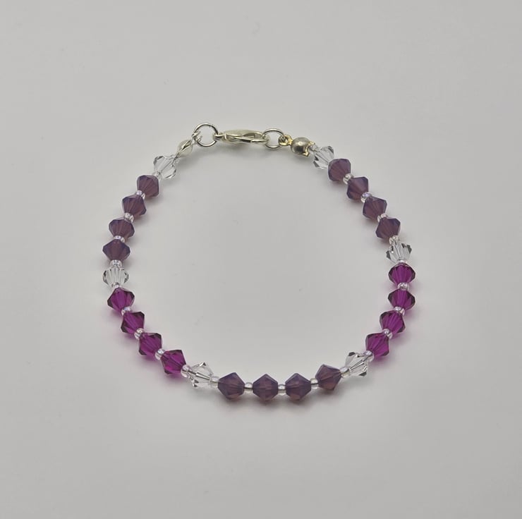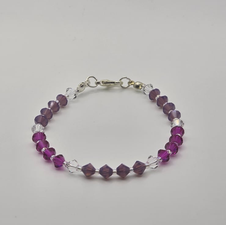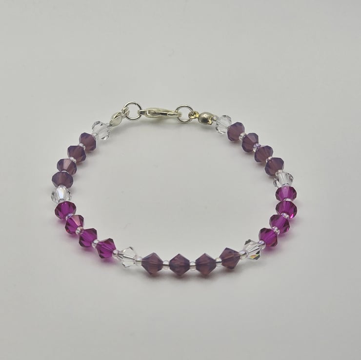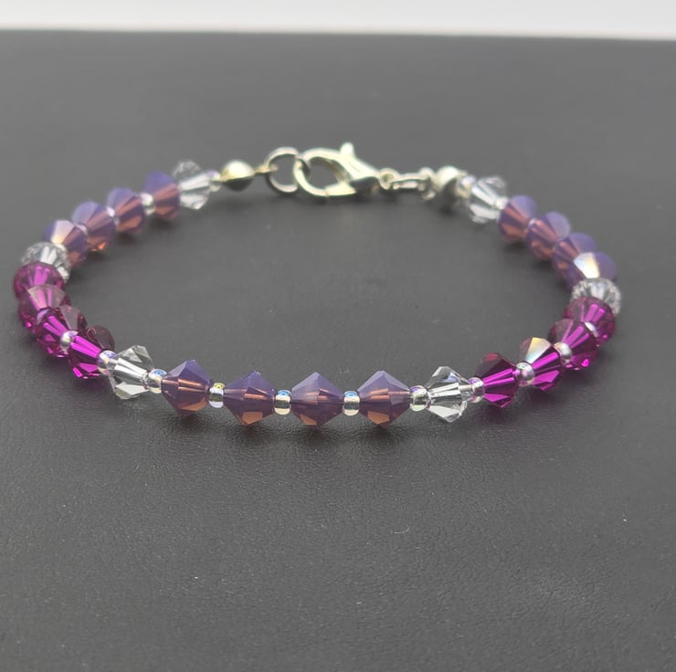 The bracelet has been made using preciosa bicone glass beads, in the colours Fuchsia, Amethyst Opal and clear crystal. The coloured sections are divided using the clear crystal beads. The beads are on a thin beading wire and fastens with a metal clasp at the back.