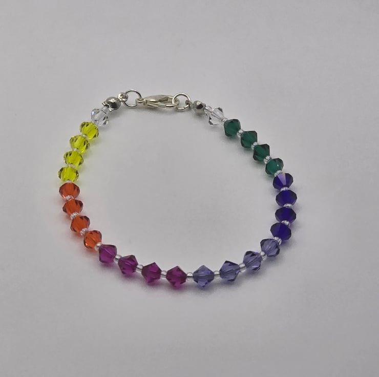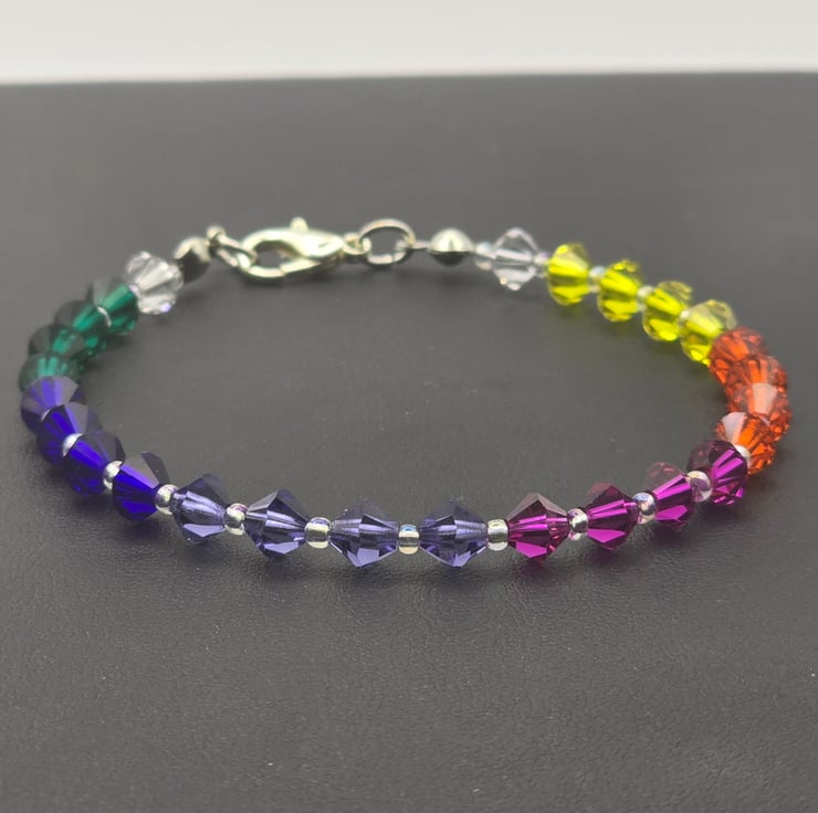 Citrine, hyacinth, fuchsia, tanzanite, Cobalt blue and Emerald. I've added a clear crystal Preciosa Crystal Bicones to the beginning and end of the bracelet creating a lovely rainbow designed bracelet. The beads are all separated with small clear crystal AB seed beads. The beads are on a thin beading wire and fastens with a metal silver clasp.