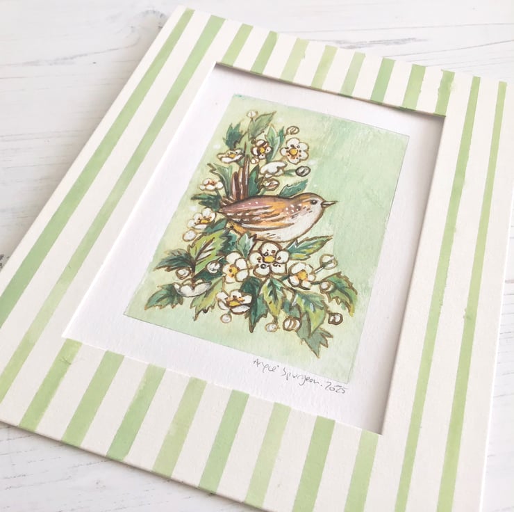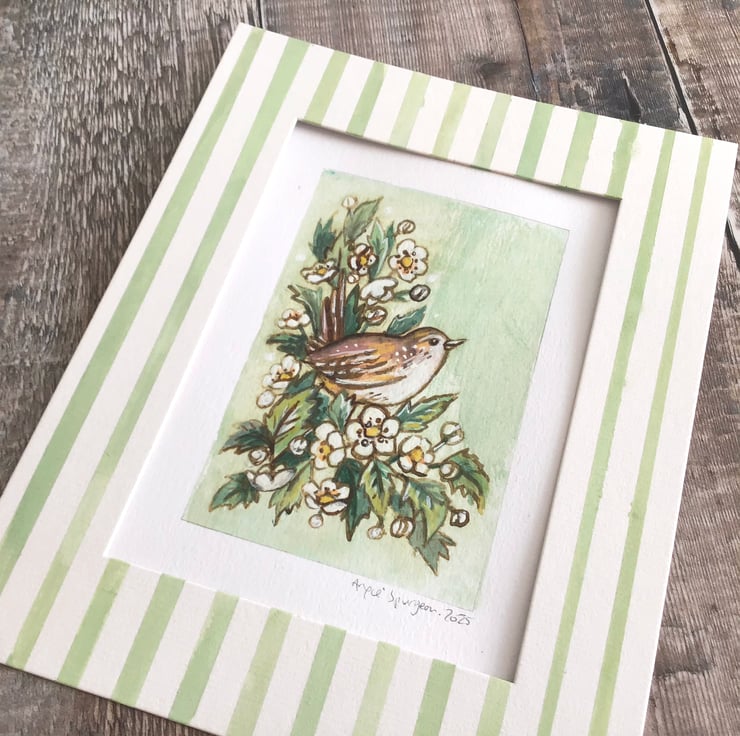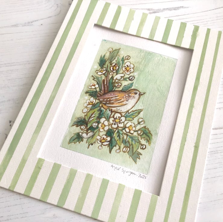 Original, one of a kind painting of a little Wren perched in the Hawthorn Blossom.