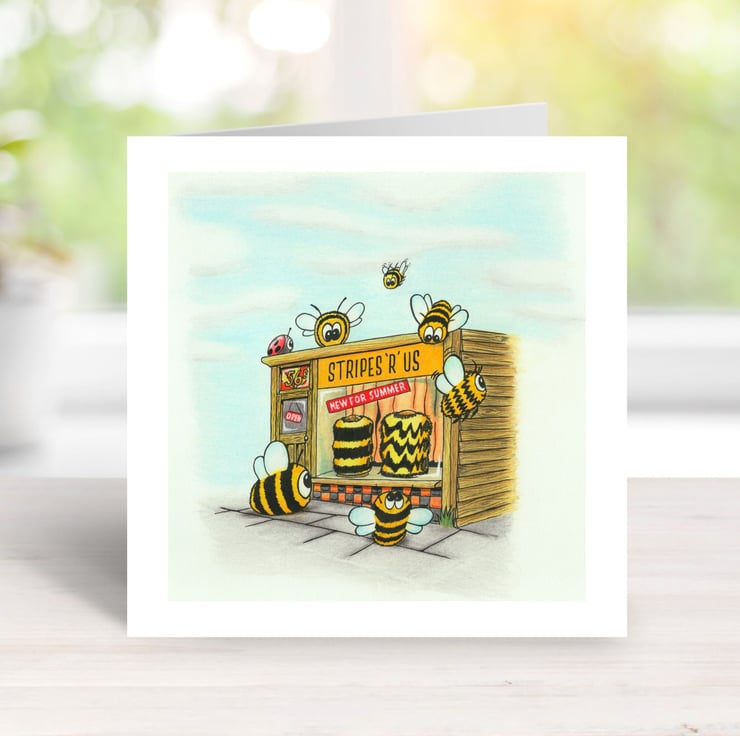 An original art greeting card, featuring a hand-drawn pencil illustration of busy bees on a fun shopping spree!