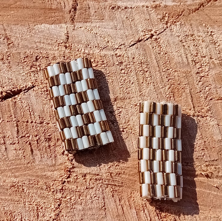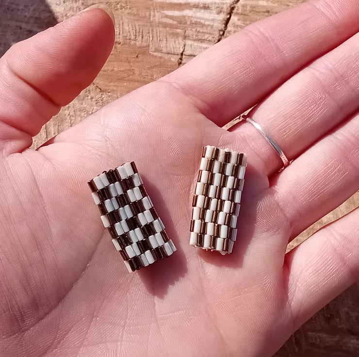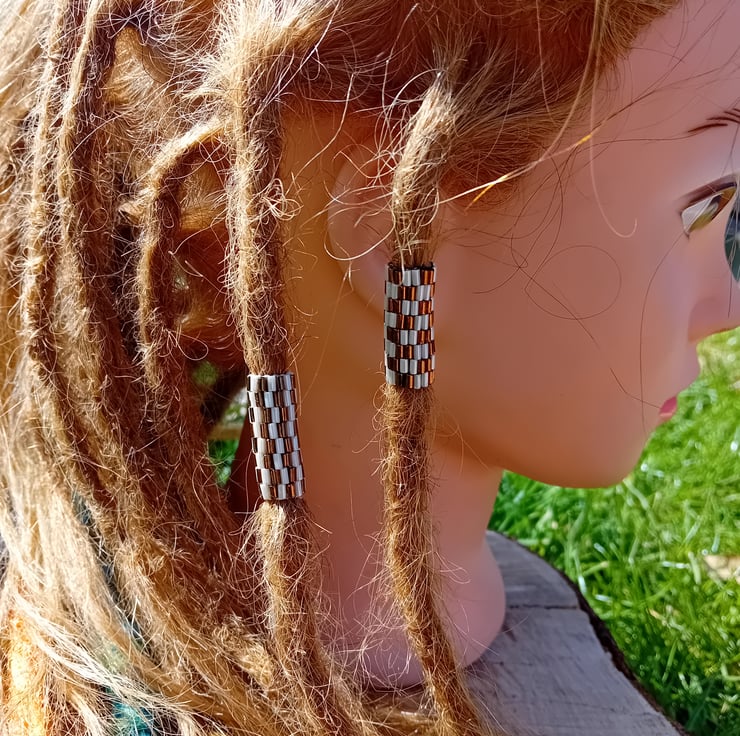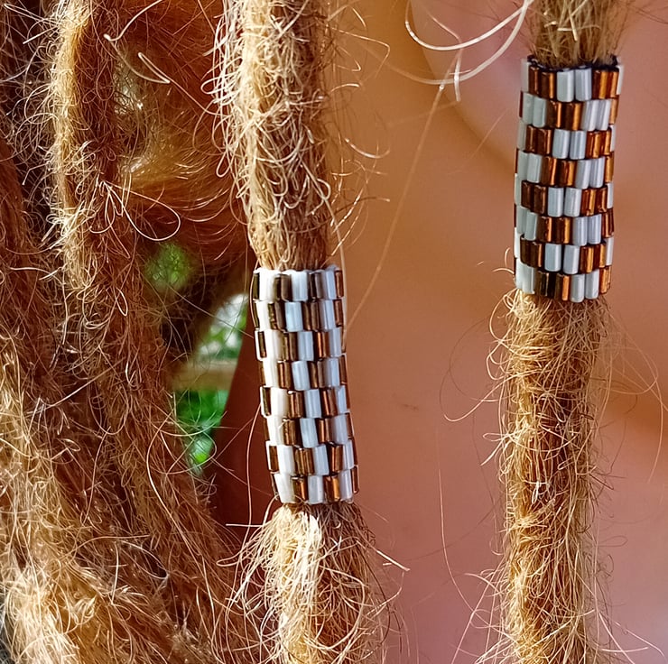 These bronze and cream striped and chequered dreadlock hair beads are made with bugle beads using the peyote beading method.