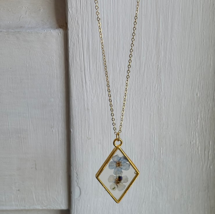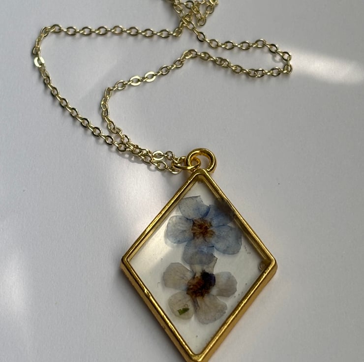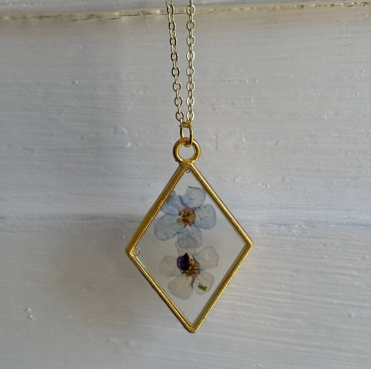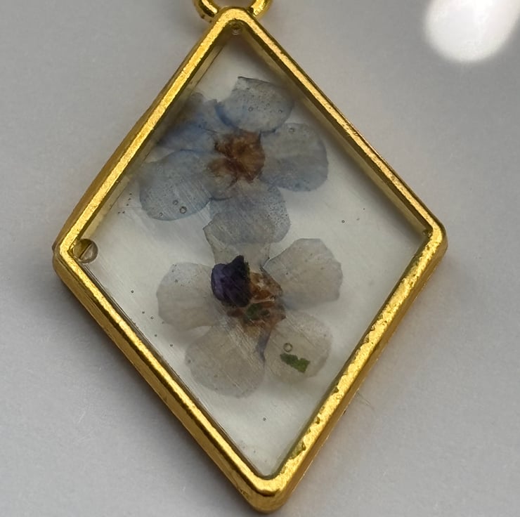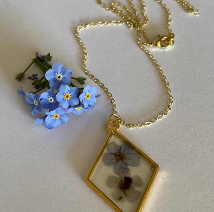 I have pressed forget me not flowers from my garden and incased them in eco resin within a brass setting and strung onto a delicate brass chain.