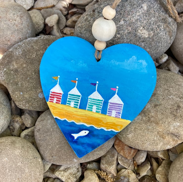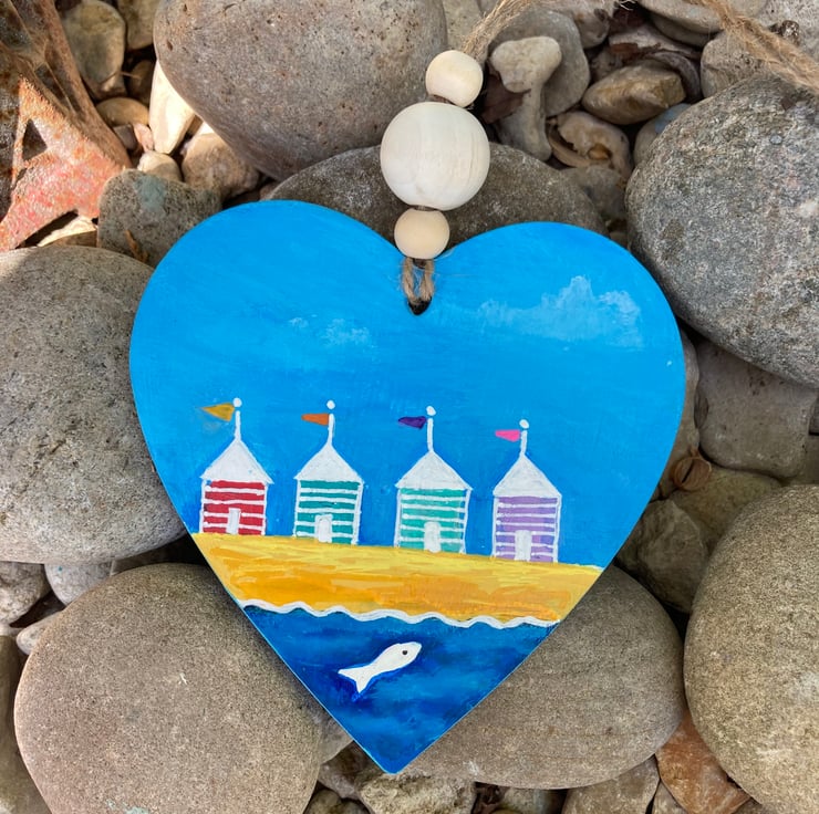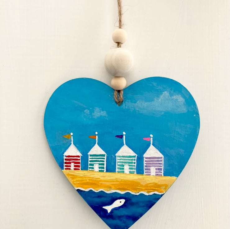 This is a wooden heart hanging decoration hand painted with quirky little beach huts, with semi abstract sea and sand and a little fish in the sea.