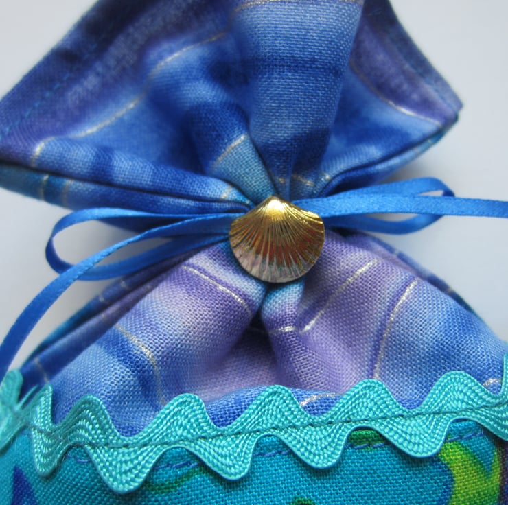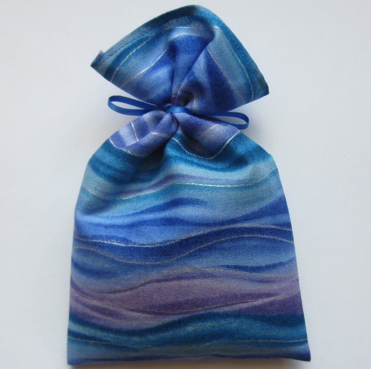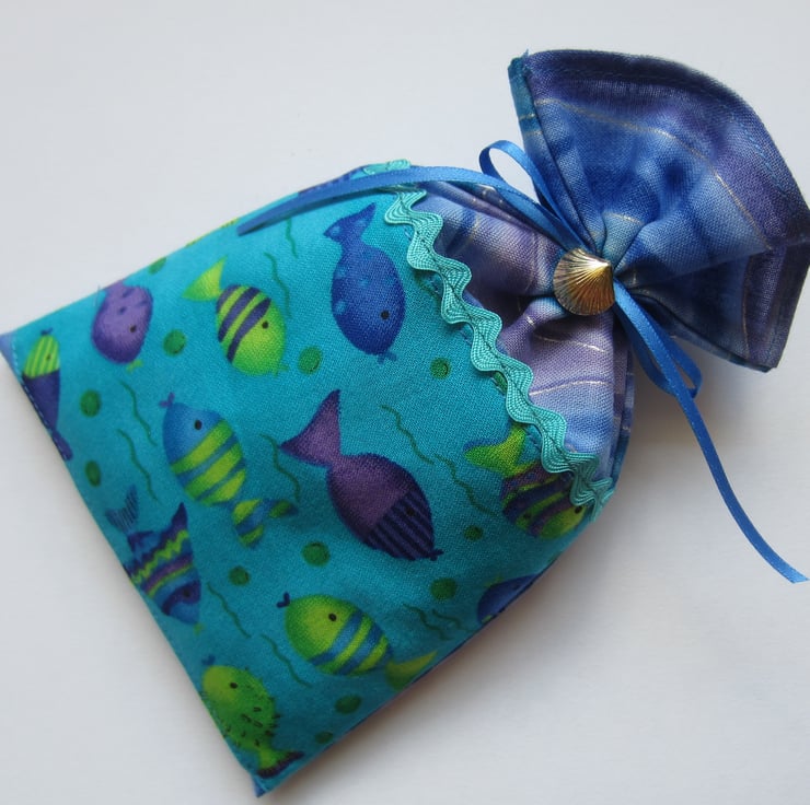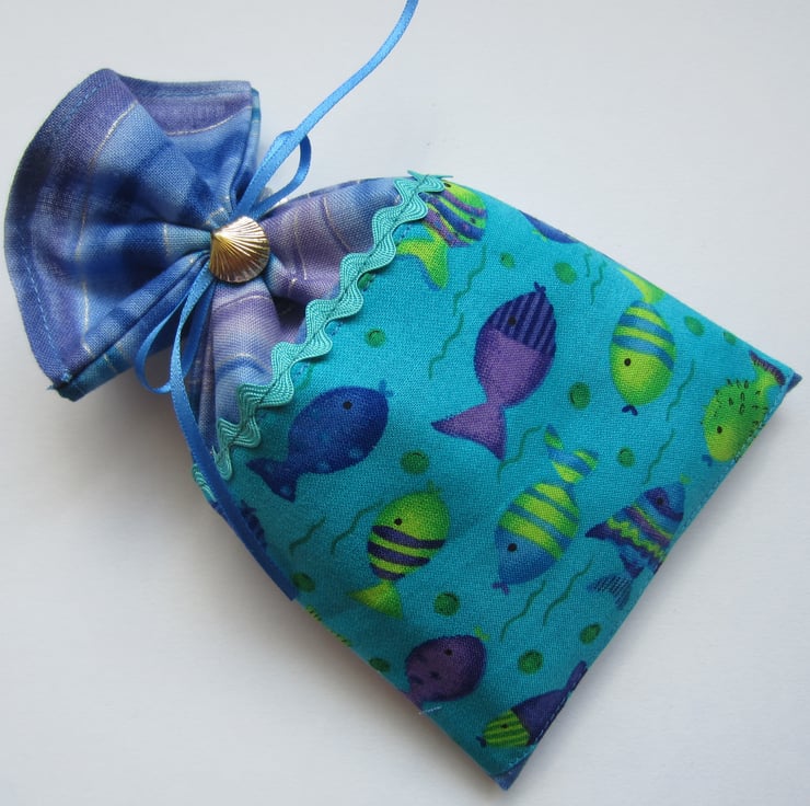 Lavender drawer sachet made from a blue and lilac wavy lines fabric and decorated with a fish panel and blue ric rac trim.