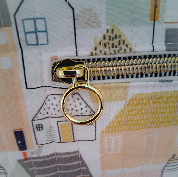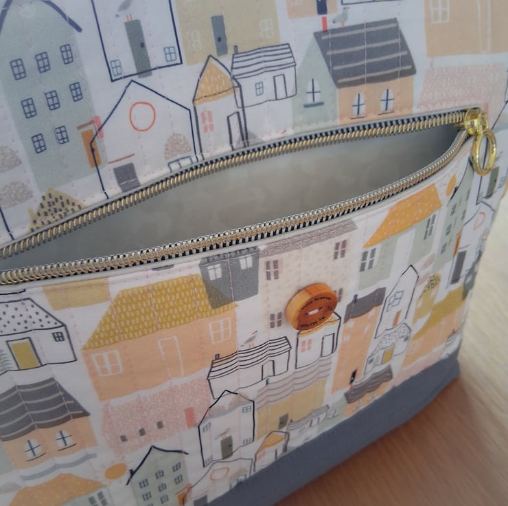 The exterior of this bag is a lovely 100% cotton printed fabric called Coast, by Dashwood. I have quilted it with straight lines and inserted a zipped pocket into the front panel. This has a matching black and white striped zip with gold coloured teeth and a circular gold coloured zip pull. I have also added a polished yew button which is my brand label.