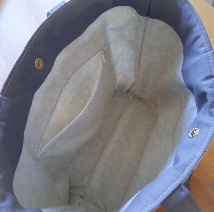 Inside the bag you will find the lining, which is a light grey tone on tone 100% cotton fabric, Bumbleberries by Lewis and Irene. I have inserted a zipped pocket with a cream zip. The bag closes with a gold coloured magnetic snap.