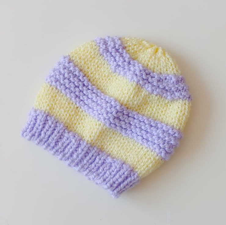 This hand knit PATTERN is for a baby hat. To fit newborn baby. Knitted in chunky yarn using 5 mm and 6 cmm knitting needles. Knit flat on a pair of single pointed needles.