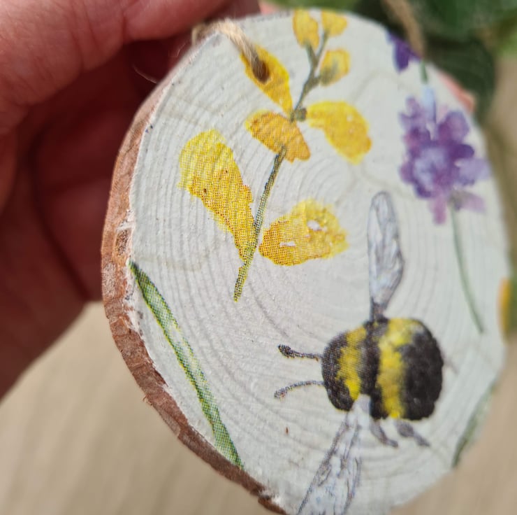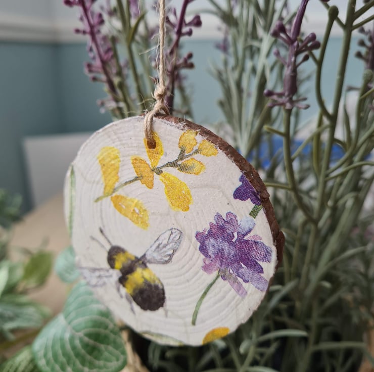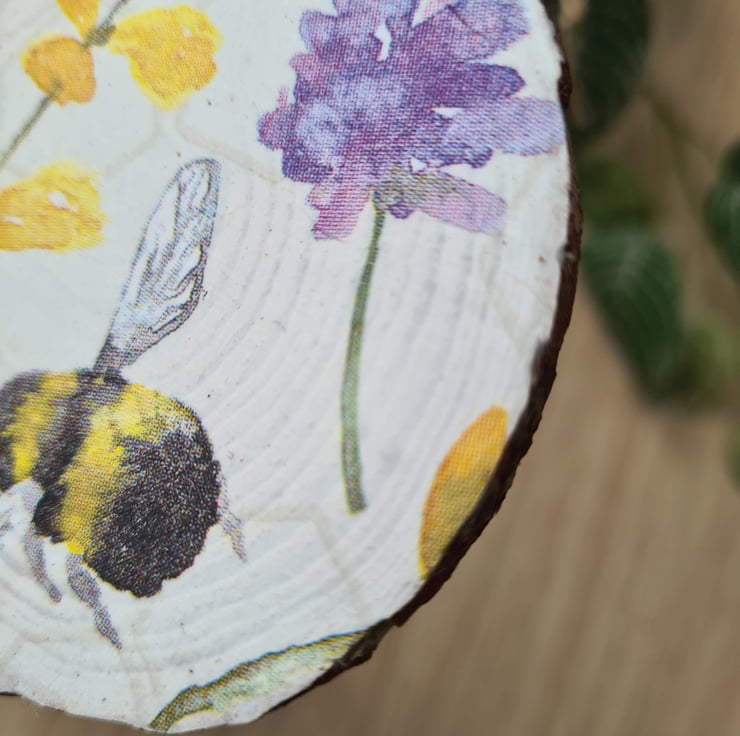 This wood slice hanging decoration has been painted then decorated with decoupage using a colourful bee and flower design paper napkin. It has been sealed with varnish and finished with twine. It is unsealed on the back.
