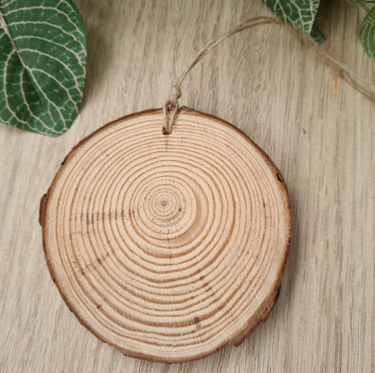 You can see and feel the texture of the natural wood rings through the decoupage - this and the natural bark edging adds to its rustic charm. Each decoration is unique and will be slightly different from the picture but the same design, and there may be some natural markings on the back.