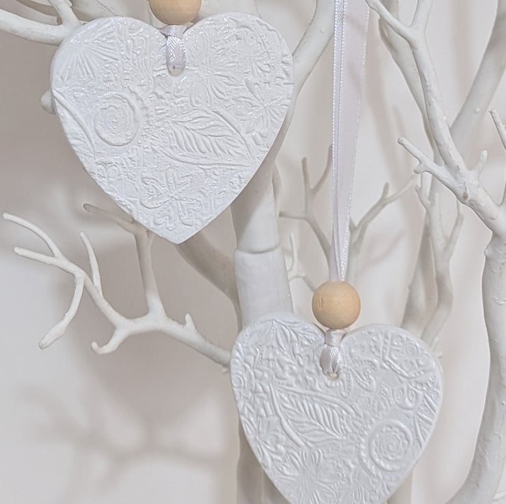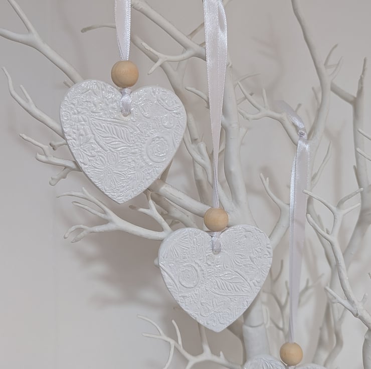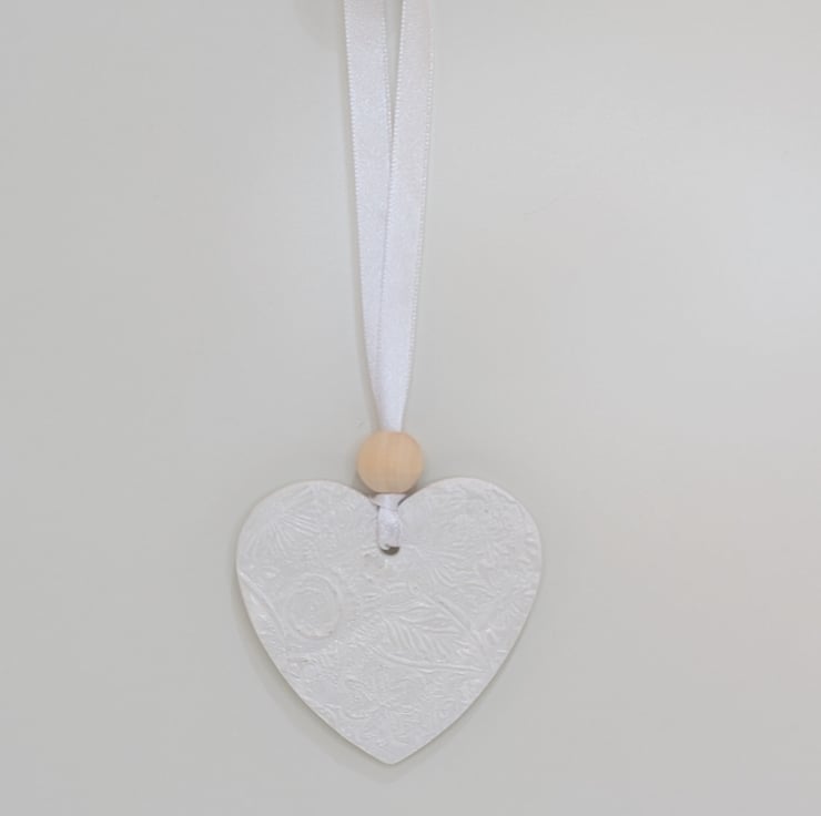 Pretty white clay hanging heart decoration which has been lovingly handmade from air dry clay and embossed with a floral pattern on both sides painted with white acrylic and varnished for extra protection. The delicate pattened heart comes ready to hang from white satin ribbon finished with a matching white bead. Would look lovely hung in a window, from a handle, attached to a gift bag or as wedding decorations or favours. This decorative heart would make a lovely gift for a birthday, Mother's day, anniversary, Valentines or thank you.