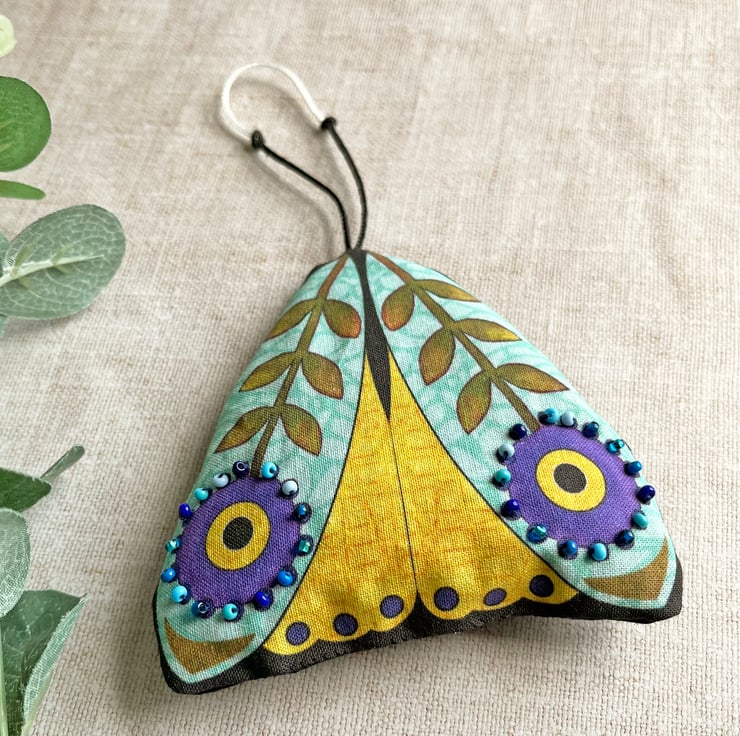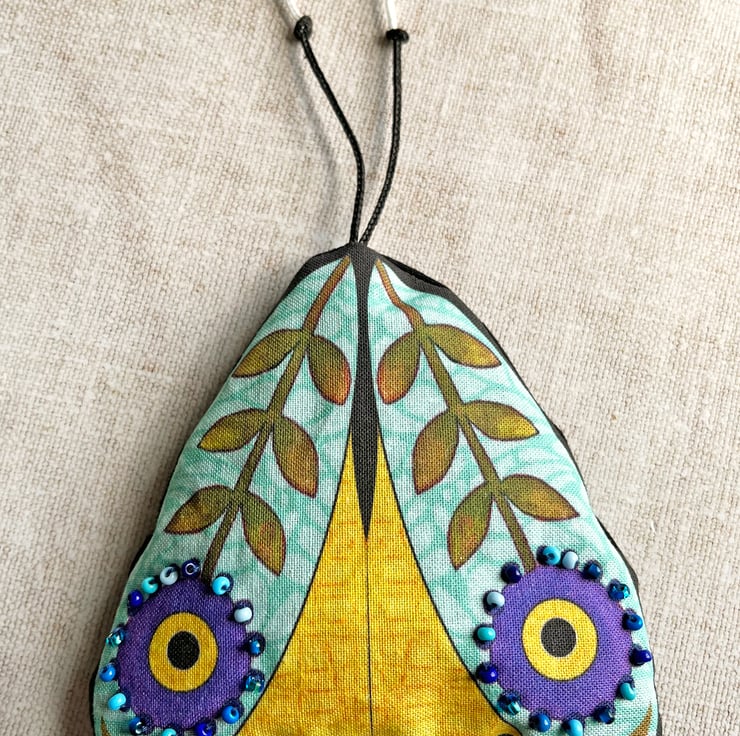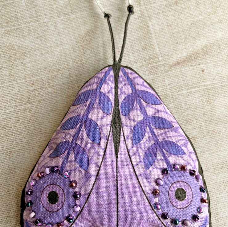 These quirky lavender bags are my own design which I've had printed onto cotton fabric. I've embellished their wings with seed beads to add texture and a bit of sparkle and incorporated their antennae into the hanging loops. The back of the bags are plain black.