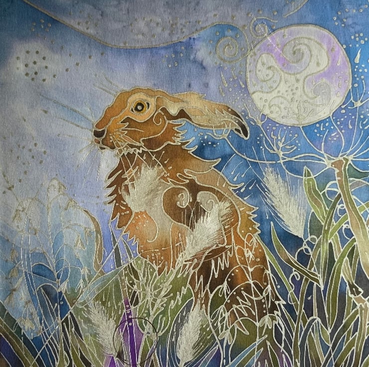 A painting of a Mystic Moon Hare. Original Hand Painted on Silk.Imbolc Moon Hare