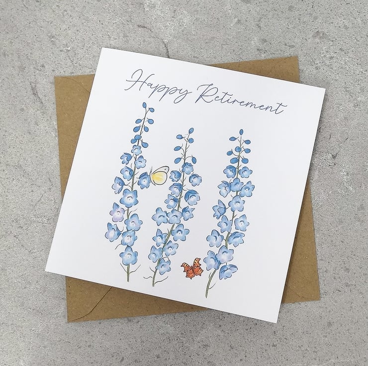 This Delphinium Retirement greeting card has been printed with my original artwork on 'New' white texture FSC approved 280gsm card and comes with a brown kraft envelope protected in a clear biodegradable bag.