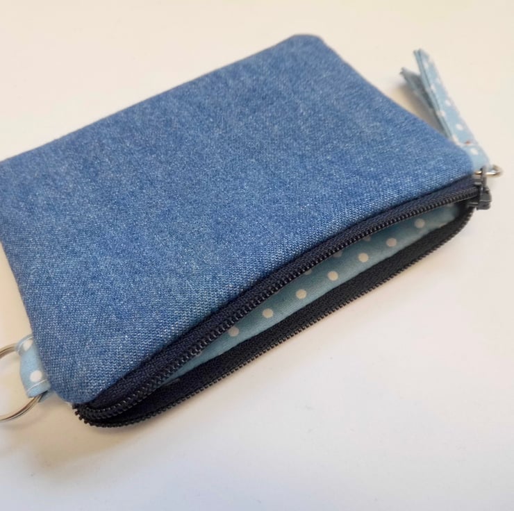 Flat style with a navy zip finished with a tab to match the lining. I've inserted a key ring into one side to make it easy to clips to your key ring or inside your bag.