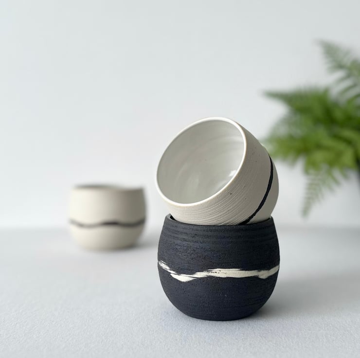 This piece was born out of my daily coffee ritual – a quiet, grounding moment that deserved an equally thoughtful vessel. Inspired by the contrast of soft morning light and deep shadows, I chose a matte body and black-white glaze to reflect calm, intentional living. The cup’s form is slightly irregular, a reminder that handmade objects carry the quiet beauty of imperfection.