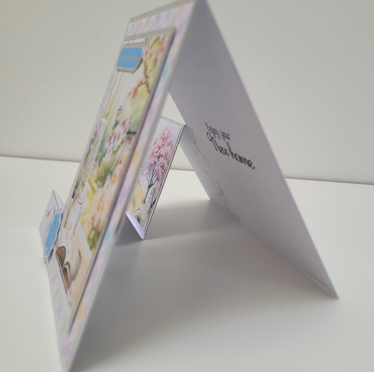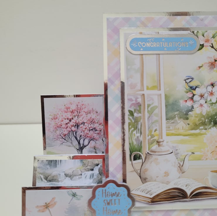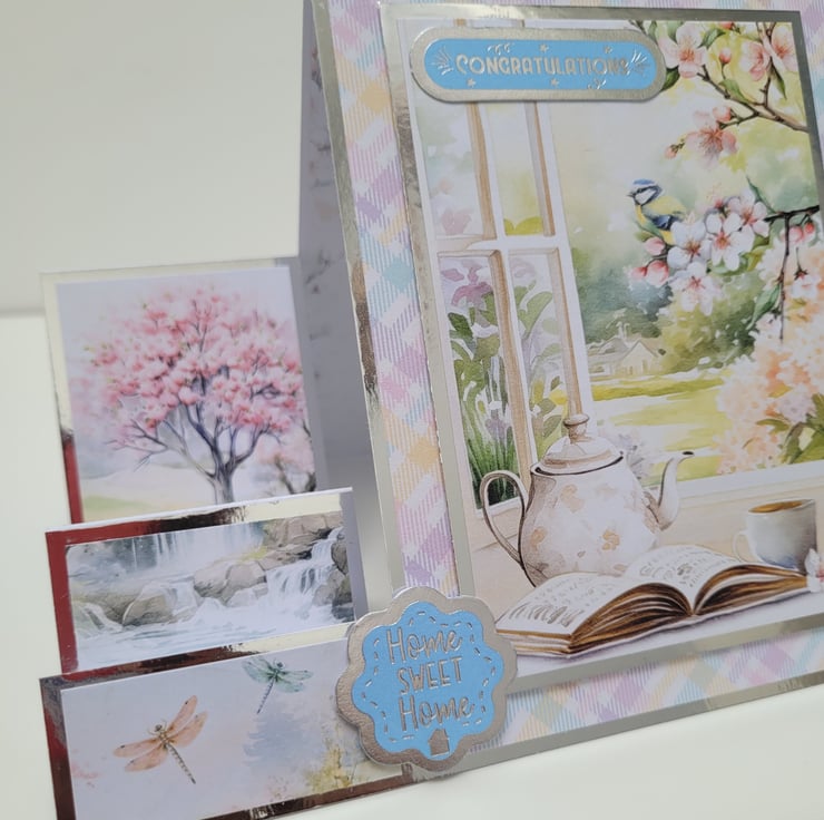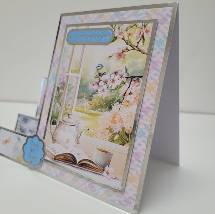 The main image features a teapot, teacup and an open book in front of an open window with a garden scene beyond. The sentiments on the front of the card read 'Congratulations' and 'Home Sweet Home', and the inside of the card has been stamped with ''Enjoy Your New Home'.