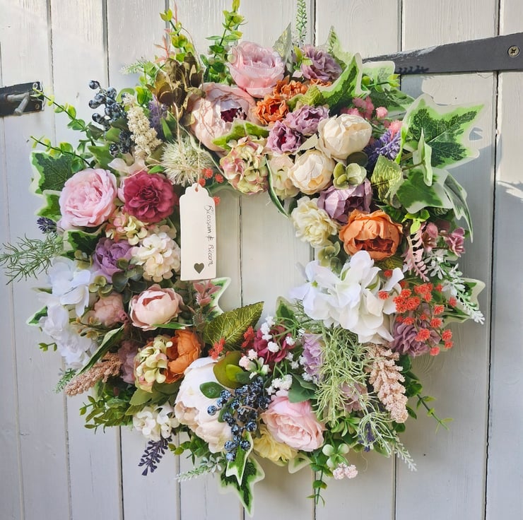 A rustic style multi floral mix premium hanging wreath adorning muted colours of hydrangeas,lavender, roses, peonies,lilac,berries,camelia & statis mixed with foliage of ivy, privet,rosemary fern & eucalyptus.