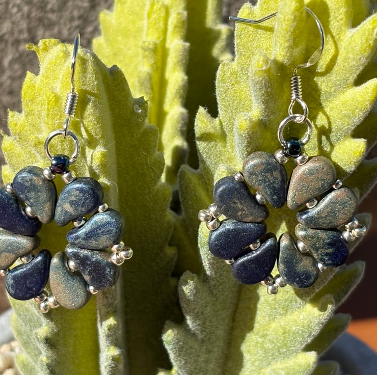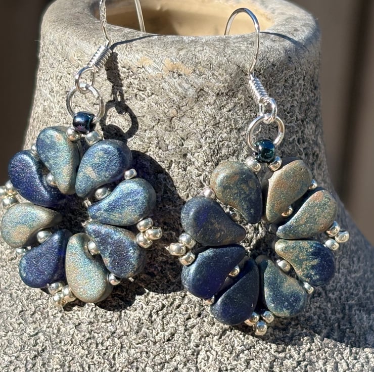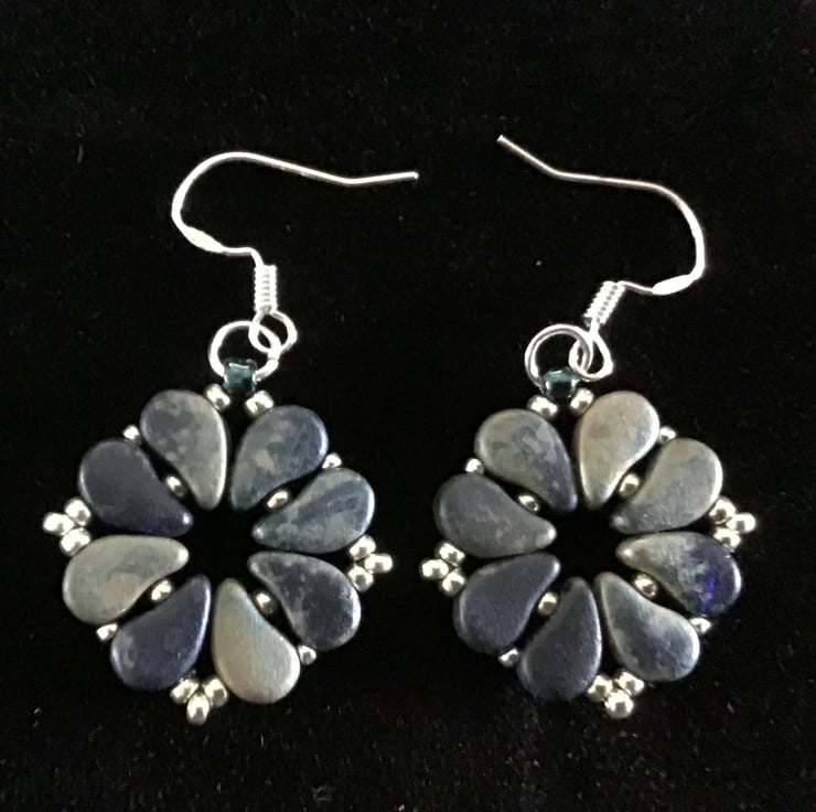 Beautiful beaded earrings with chalky denim paisley shaped superduo beads accented with silver myuki seed beads on a silver coloured anti allergenic, nickel free earwire.