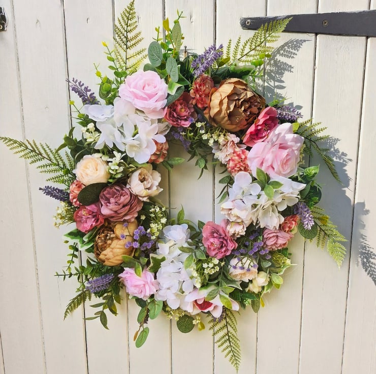Go back in time with this vintage victorian style mixed floral wreath with gold peonies,roses,orchids,lavender, gypsohilia & camelia one mixture of leafy green,ferns,eucalyptus & ivy.
