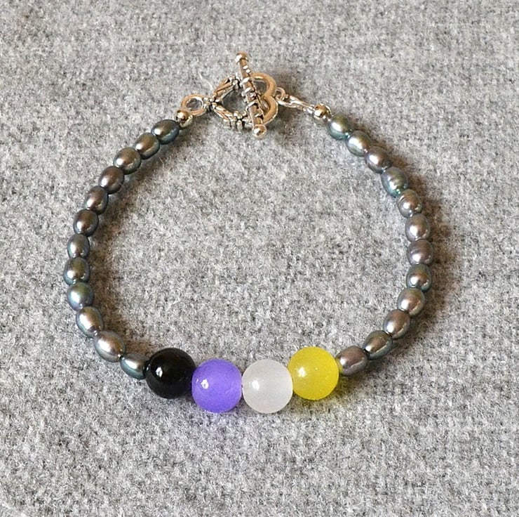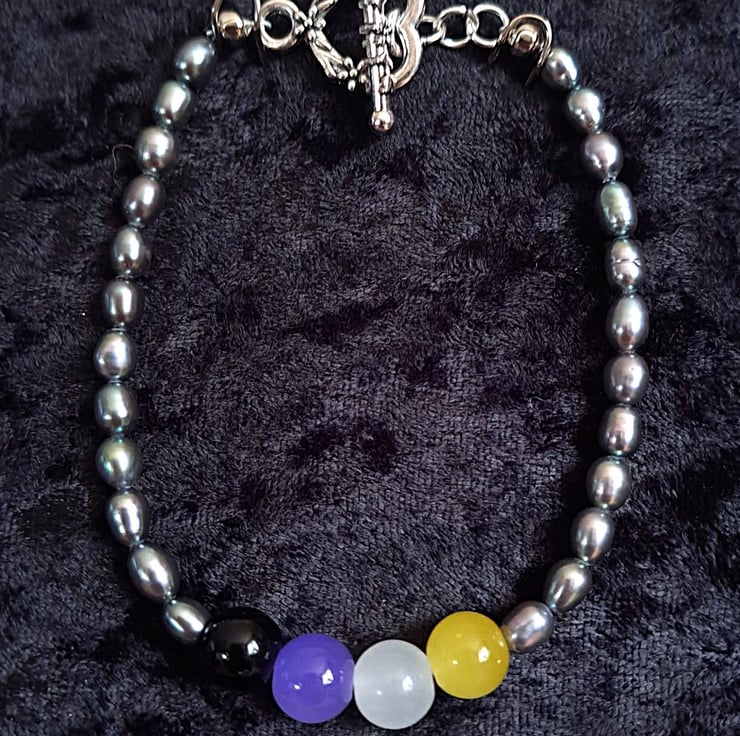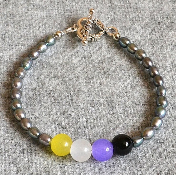 The colours of the nonbinary pride flag work so well with these iridescent grey oval glass pearls, I was tempted to keep this one for myself.