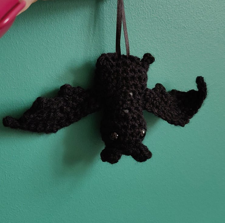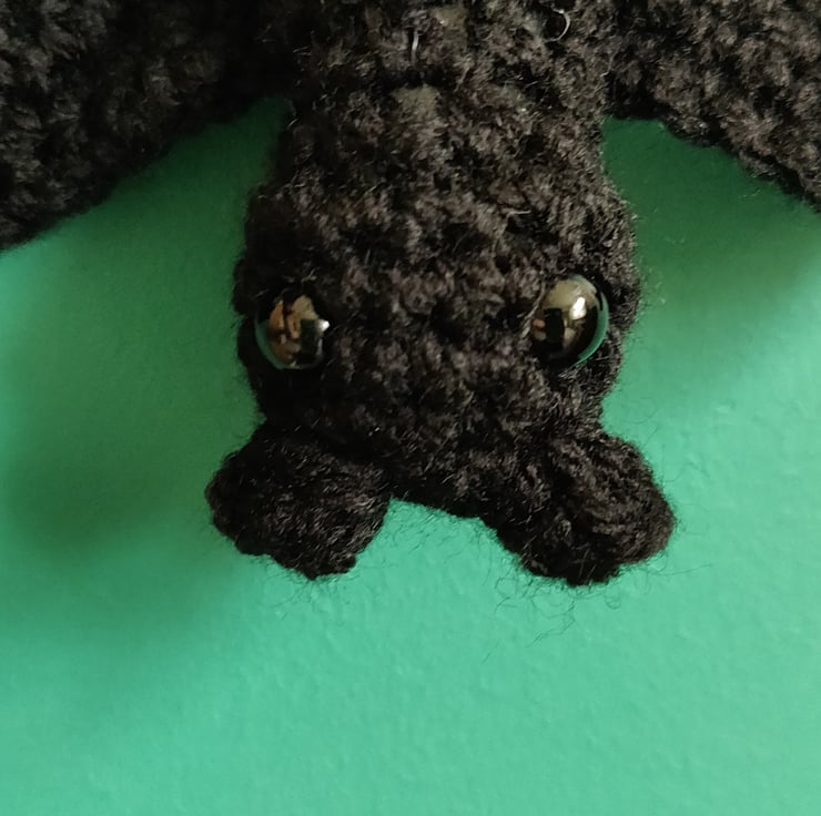 He is crocheted in black wool with black eyes, wings and ribbon to hang it up.