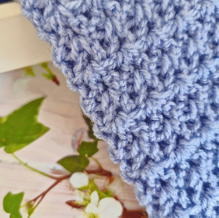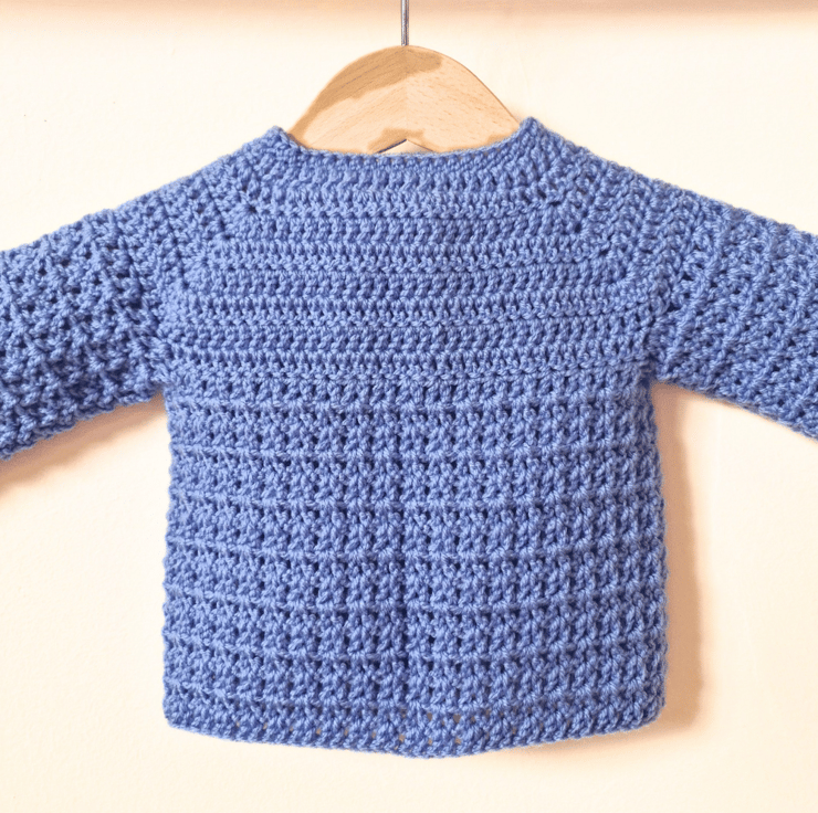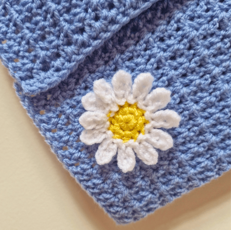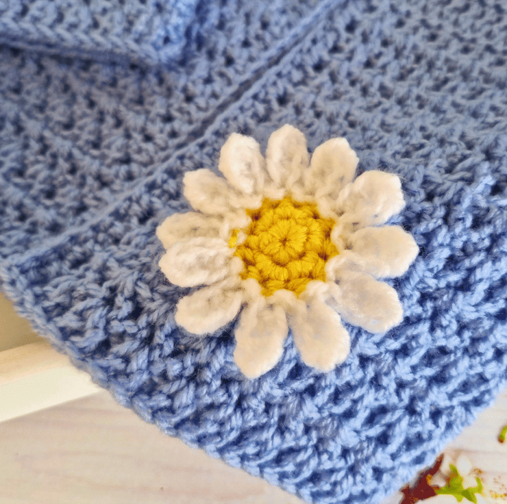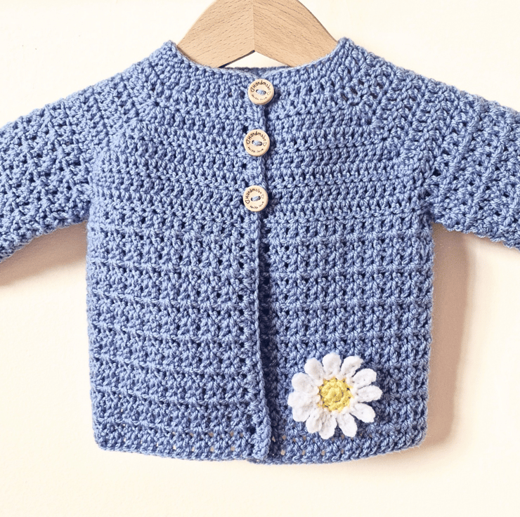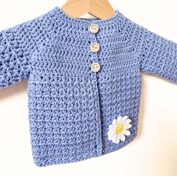 Crocheted in one seamless piece using Stylecraft Special DK yarn, it's gentle on delicate skin with no bulky seams. The body and sleeves feature a subtle V-stitch texture, and a hand-stitched daisy adds a timeless, heartwarming detail.