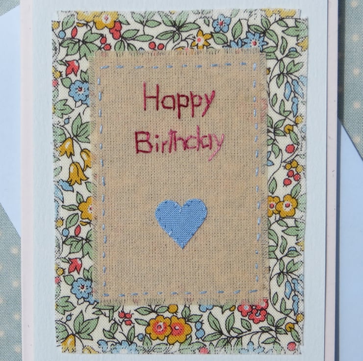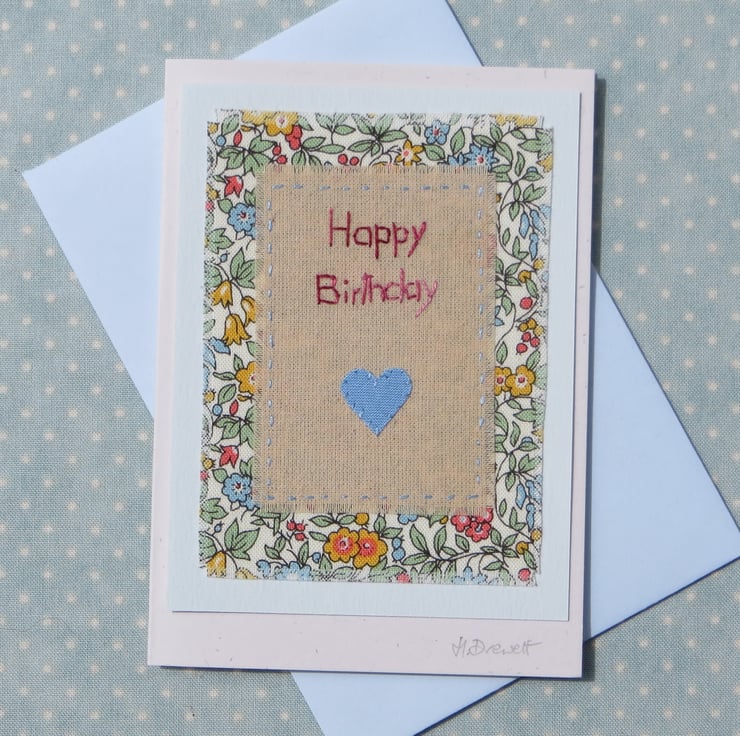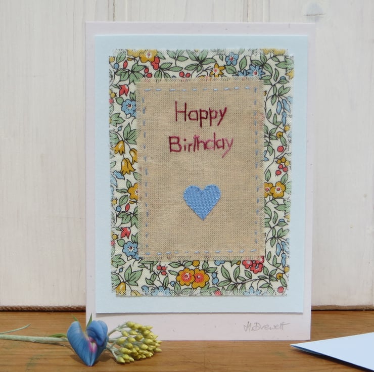 For this card I have embroidered the words 'Happy Birthday' adding a little applique heart. I then stitched the embroidered panel to a lovely piece of pretty Liberty cotton print fabric for the background.
