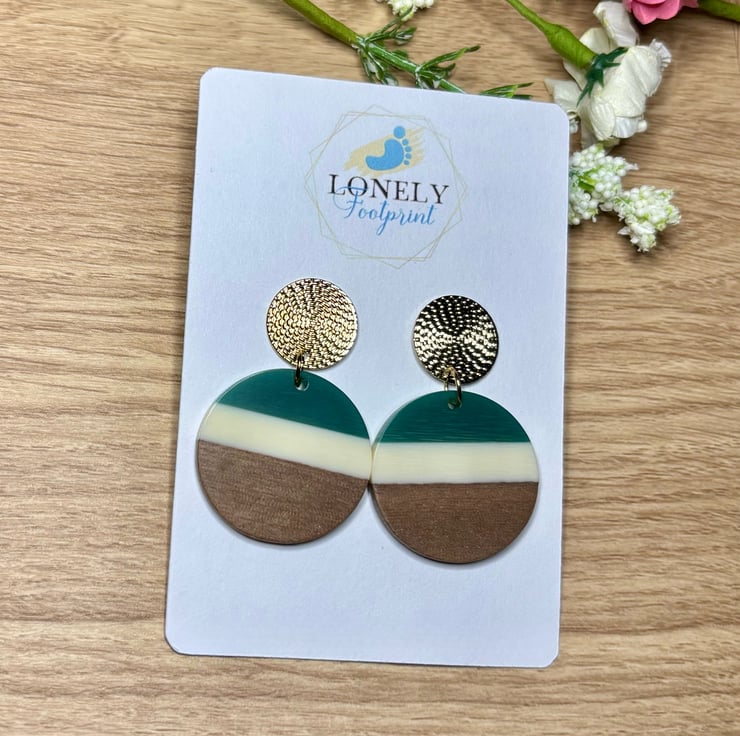 Boho statement earrings featuring a green, white, and wood effect design. These lightweight dangle earrings are paired with textured gold tone studs. Perfect for everyday wear or as a thoughtful gift.