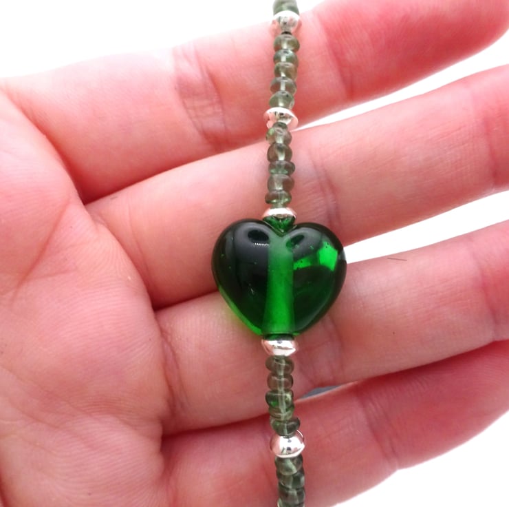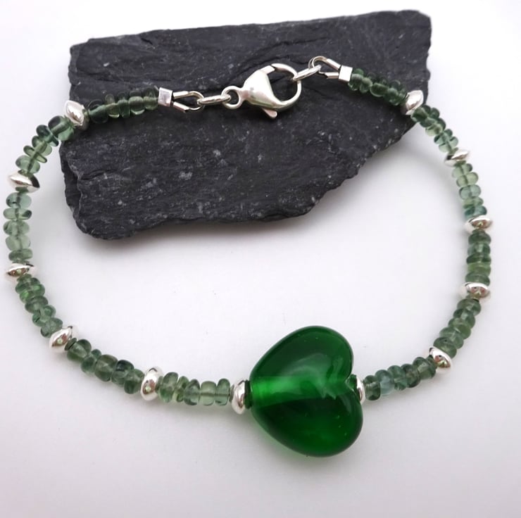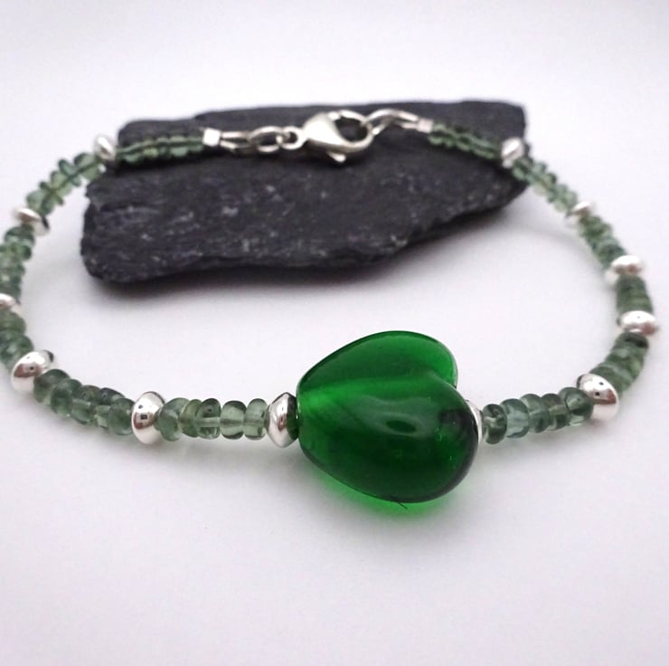 A bracelet made with Apatite gemstone beads and sterling silver beads. The bracelet features a handmade lampwork glass green heart bead.