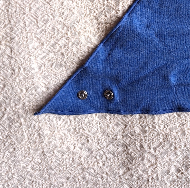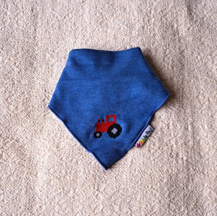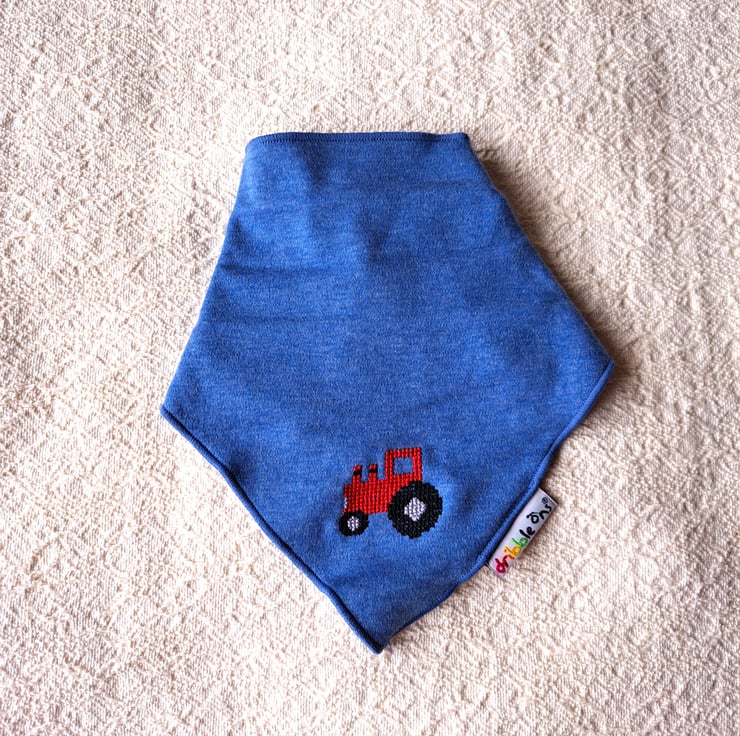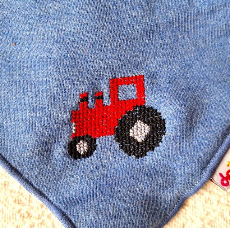 I have hand embroidered a red tractor with grey wheel hubs on the bottom corner of a gorgeous denim blue bib by dribble ons. The bib is adjustable, fastening at the back of the neck with either of two press studs. The front is all cotton and the back is white polyester cotton towelling. It is machine washable.