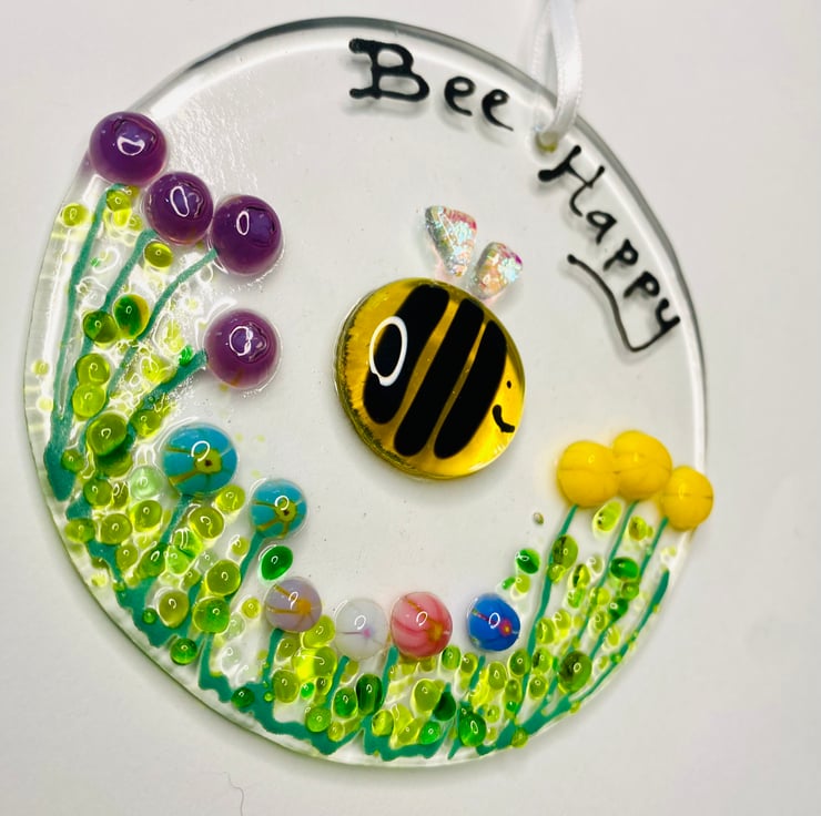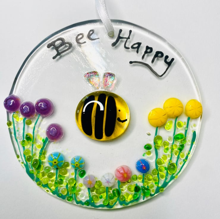 This beautiful handmade glass sun catcher is unique and flowers will vary in shape size and colour .