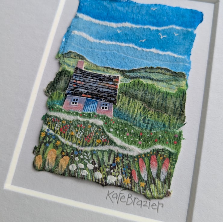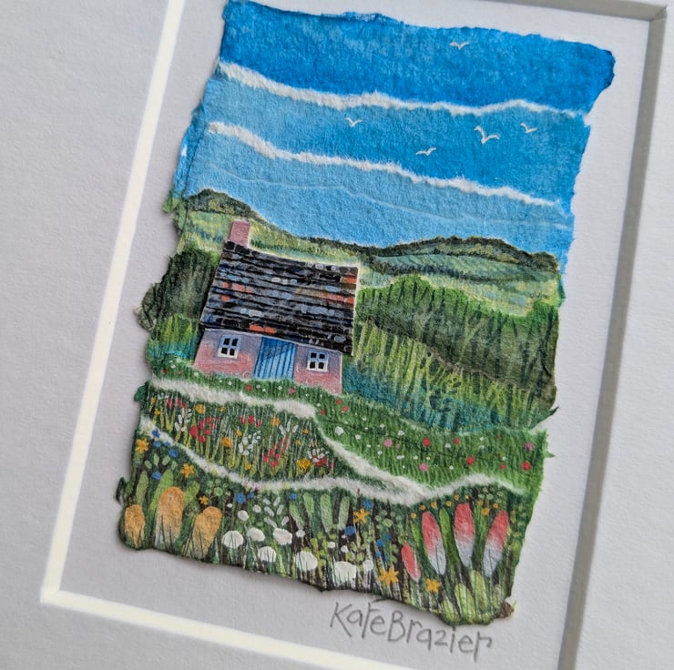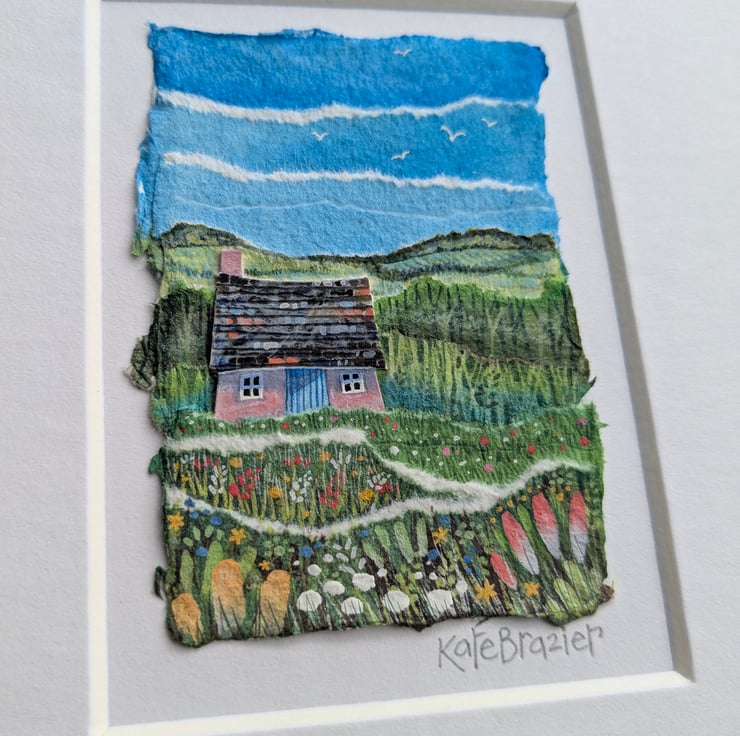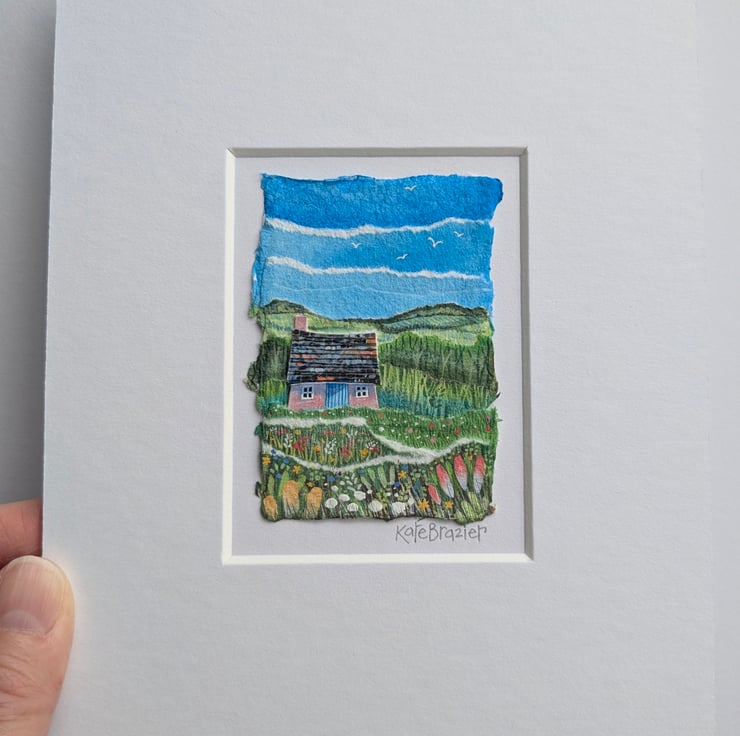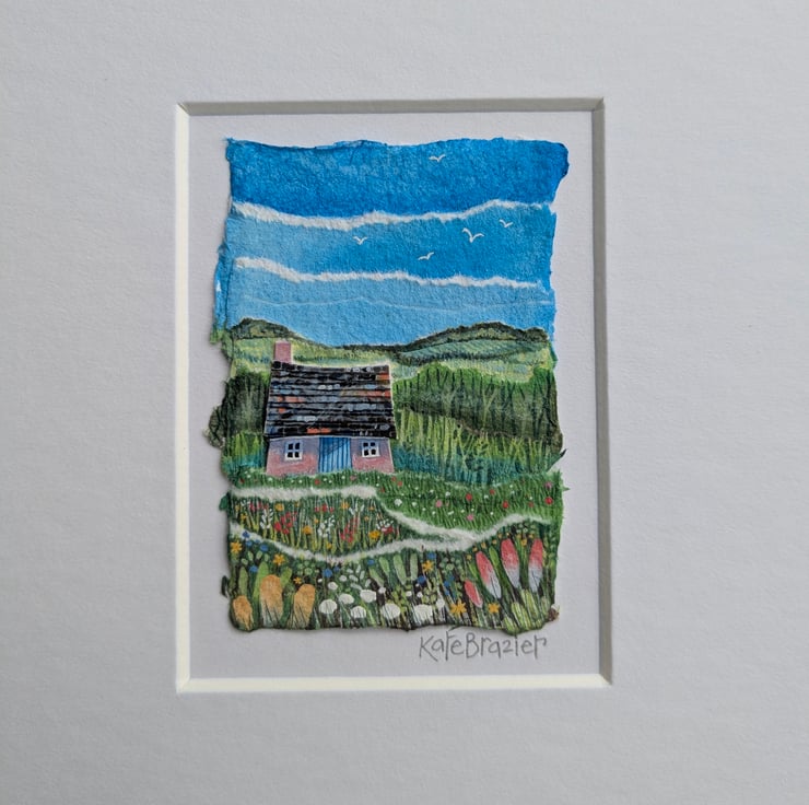 'Idyllic Cottage' is a tiny, mixed media collage float mounted into a custom A5 mount.
