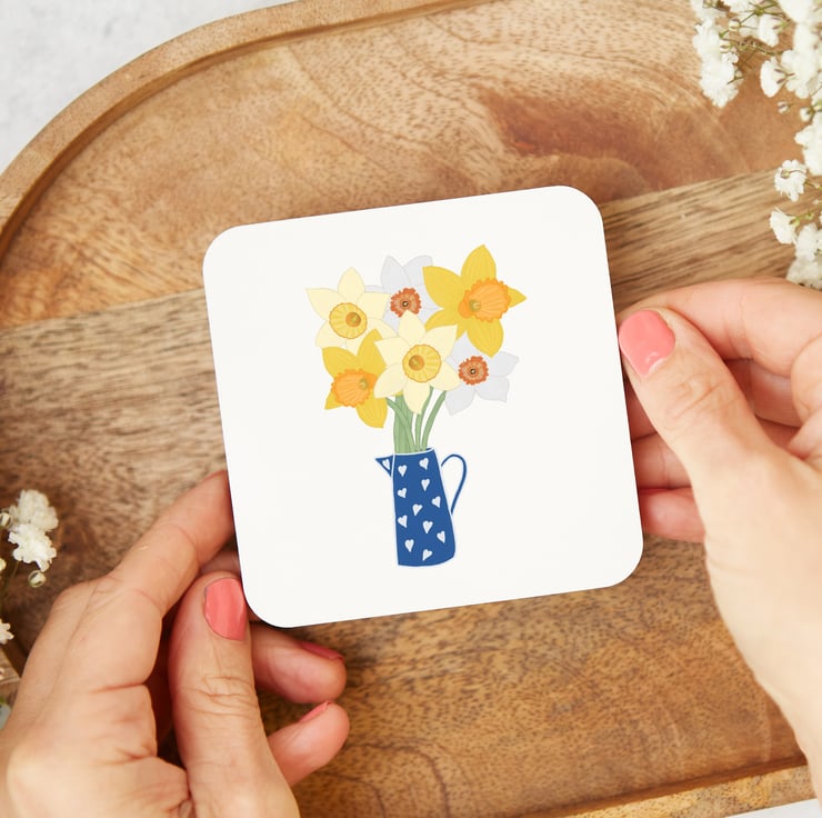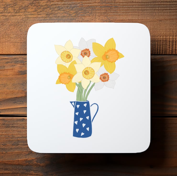 Daffodil Coaster - joyfully hand drawn and then printed by a small family-owned business in the UK. Matching mug also available. 9 cm square coaster with rounded corners, sturdy hardboard back and wipe-clean finish on the design side. If purchasing as a gift, I can post directly to the recipient with a note. Please just send me a message at checkout.