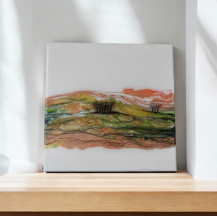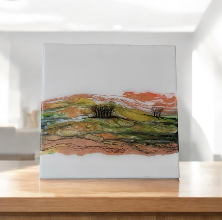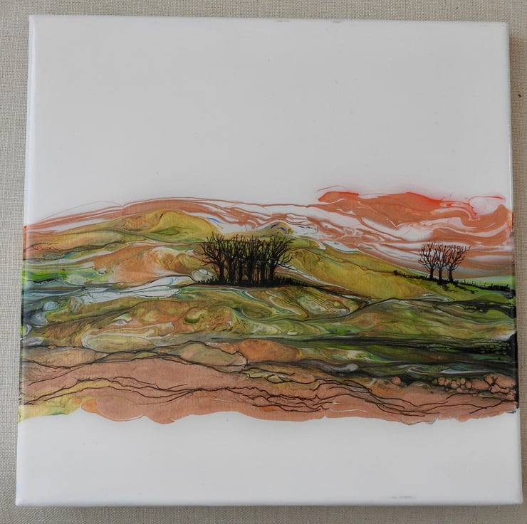 A fluid acrylic painting showing Rothbury hills Northumberland in late Autumn on a windy bright day , the painting is finished with a coat of eco resin that gives a glass like finish .
