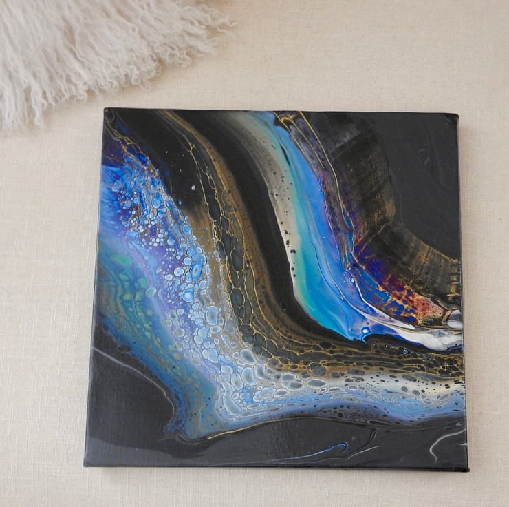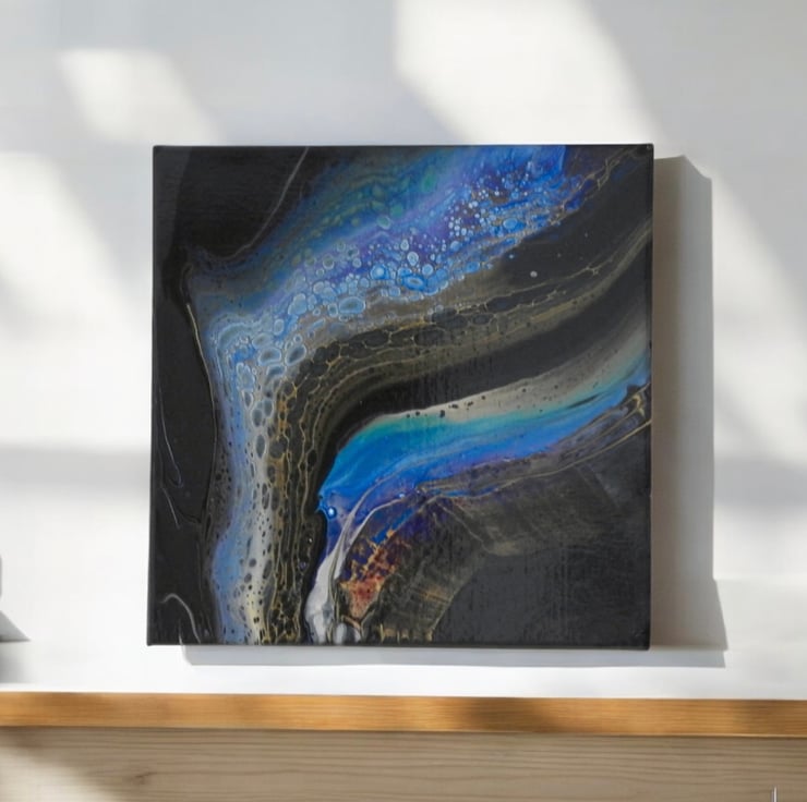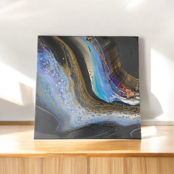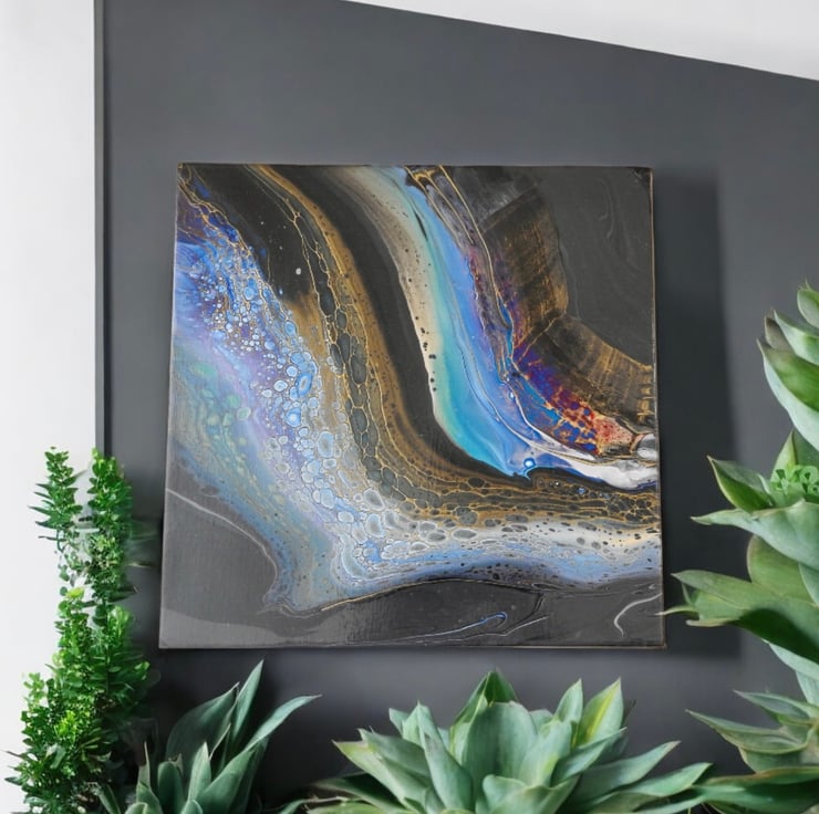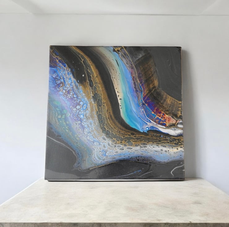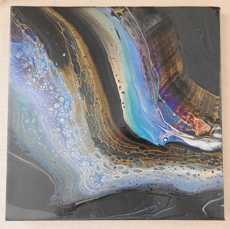 A fluid acrylic painting with blues and golds on dark grey with a hint of magenta. Inspired by the rivers flow cell reaction on this one is stunning.