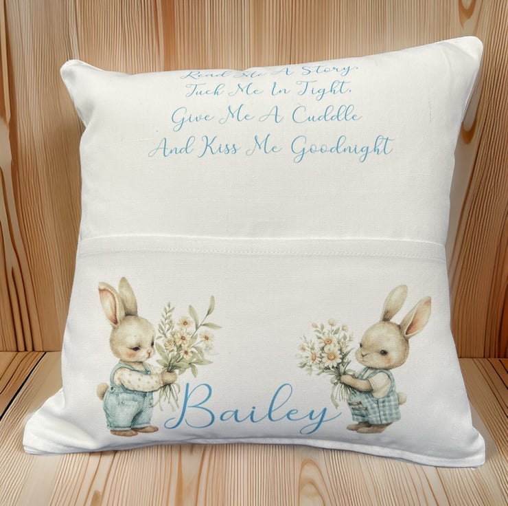 These are made in a linen canvas effect c. 20 inch square. The name of your choice printed along the top and the bunnies on the pocket holding the book ready for a story and perhaps a nap. This is a beautiful addition to a nursery and a great way to make memories.