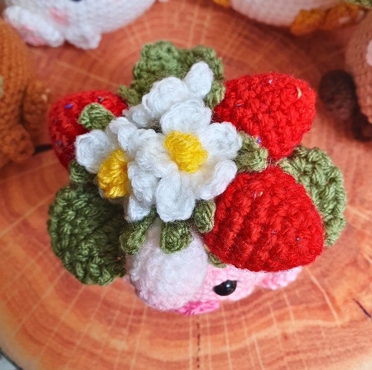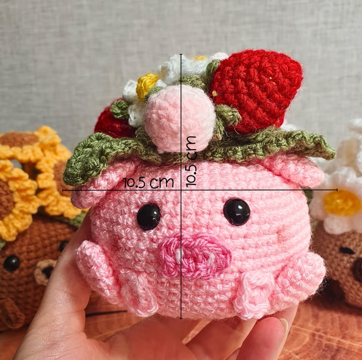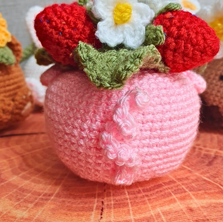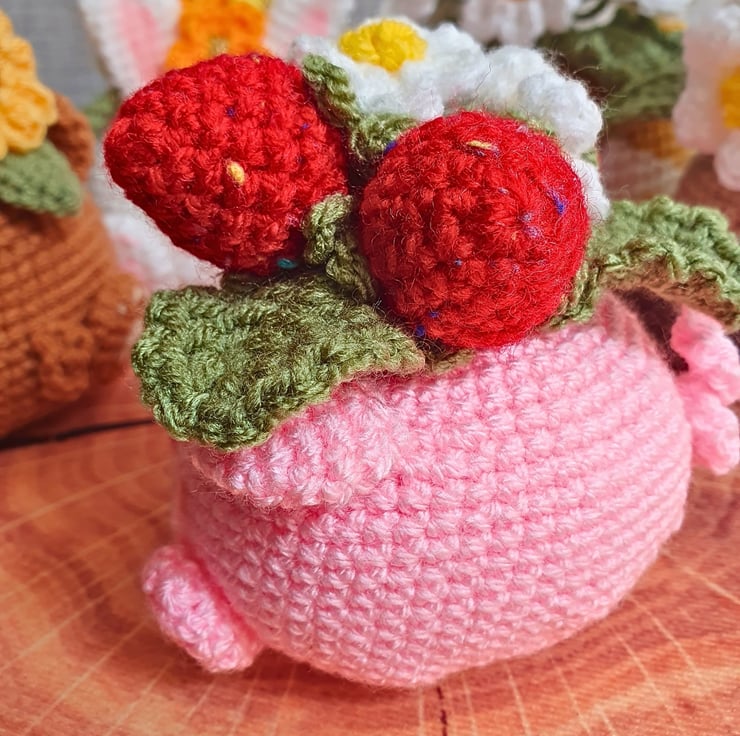 This decorative item consists of two parts, the pot & the stem of strawberries, both hand crocheted with premium acrylic yarn. The amigurumi pot is in round shape & in pink colour, with crochet ears, legs, nose & a pig tail sewn on it and plastic safety eyes attached. All working together to mimic the general image of a pig. The flower stem consists of 3 red strawberries, 1 white strawberry, 3 white myosotis flowers and 3 leaves, all joined together and sewn into the pig pot, so it cannot be taken off.
