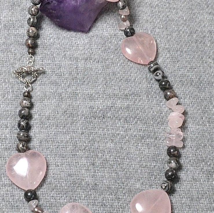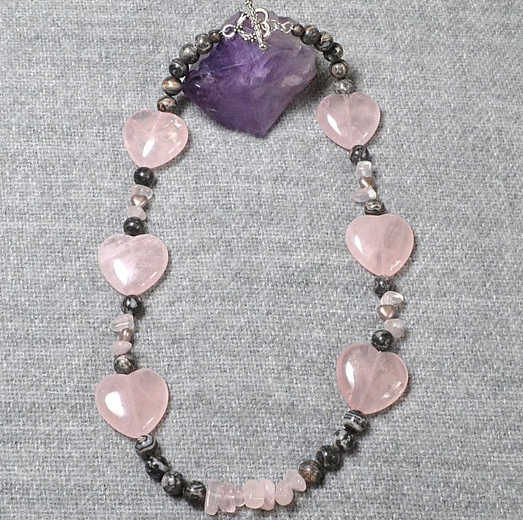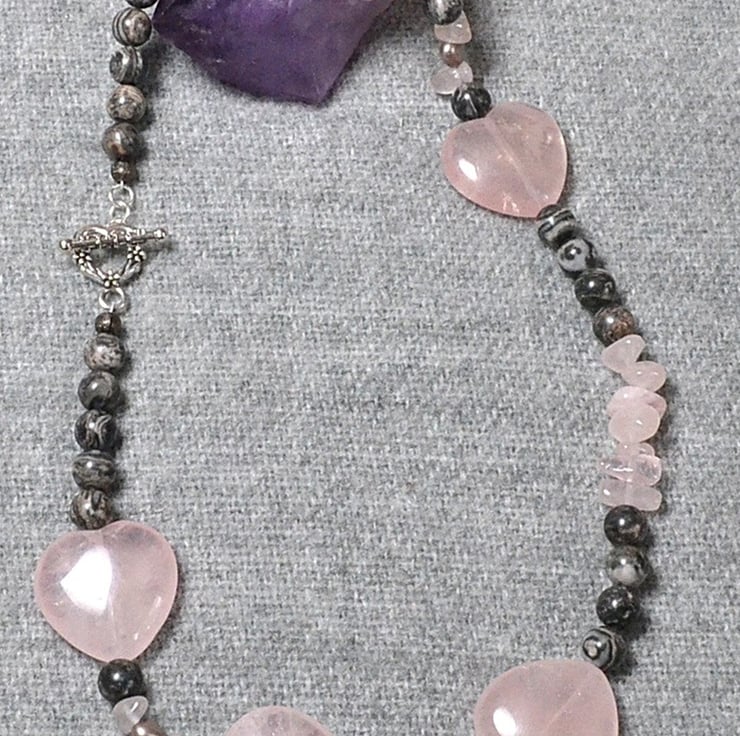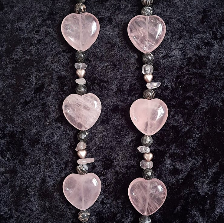 This is a pretty and quite weighty piece. The gorgeous rose quartz hearts are definitely statement beads, but the overall effect is charmingly soft and understated. The necklace is approximately 46.5cm, or 18 1/2 inches long, and is finished with a silver plated toggle clasp.
