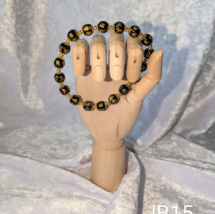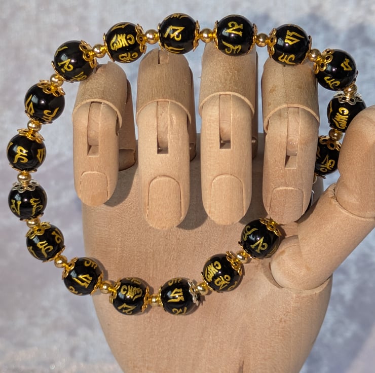 Beautiful black, round natural stone, beads with gold writing, symbolising Buddhist prayers. Each bead has 6 prayers represented on them. Each bead has gold coloured end caps and a small round gold coloured bead in between.