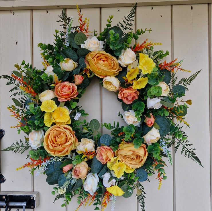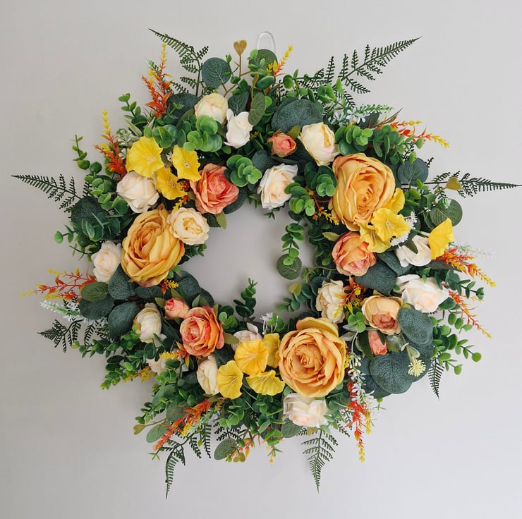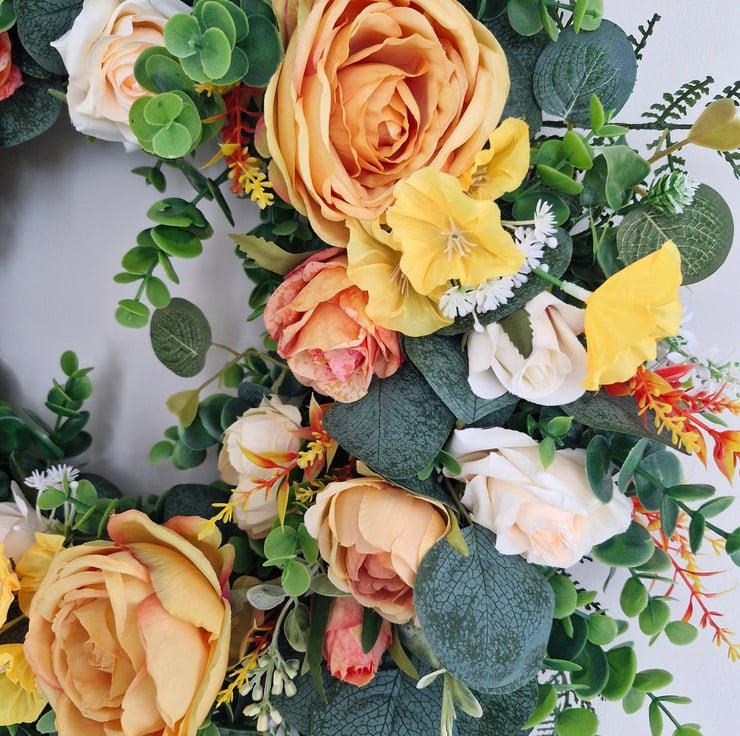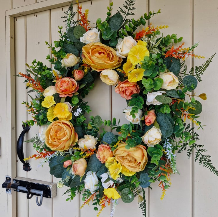 This bright cheerful wreath has all the colours of a summer sunset, embellished with yellow/orange large peonies, vintage orange roses, rich yellow petunias,lemon mini peonies, white lavender,lemon/cream roses & full lush foliage.