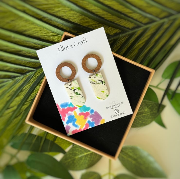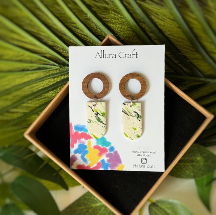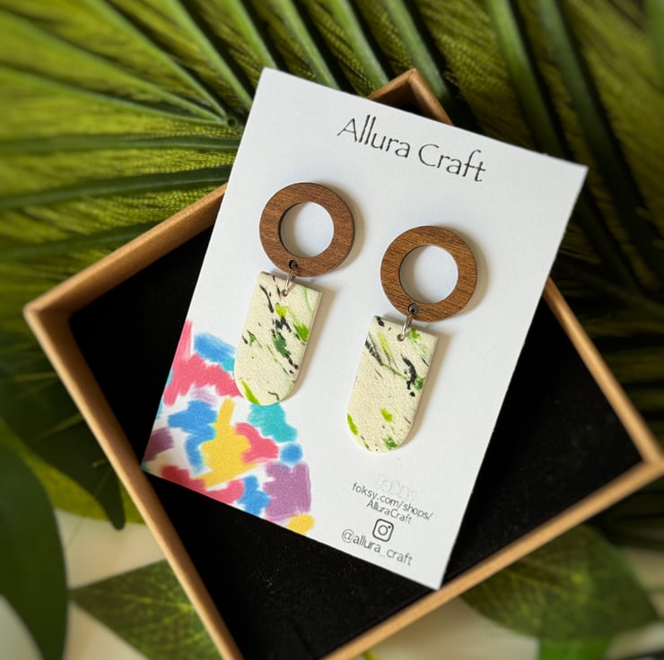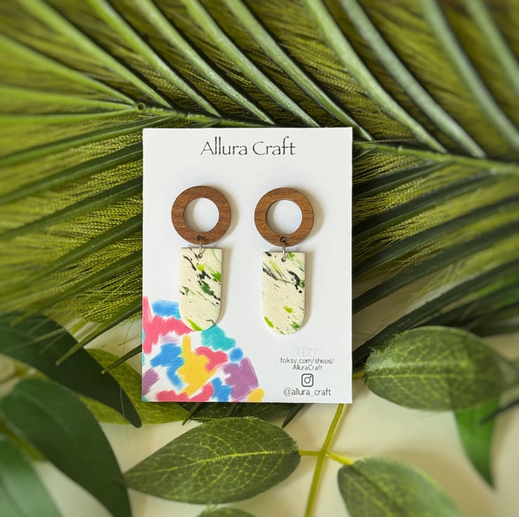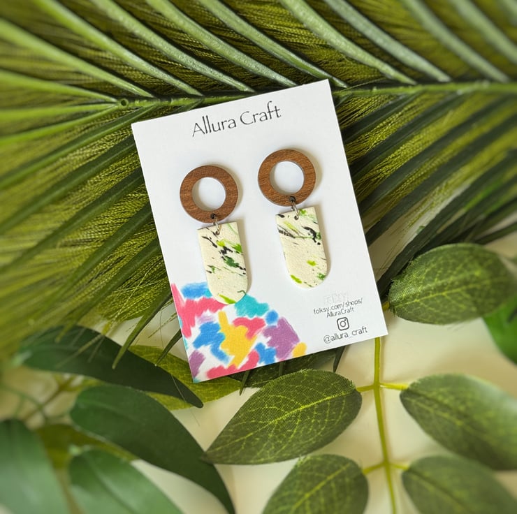 Sustainable style meets natural beauty in these handmade earrings featuring circular walnut wood studs paired with elegant white polymer clay elegant arch drops.
