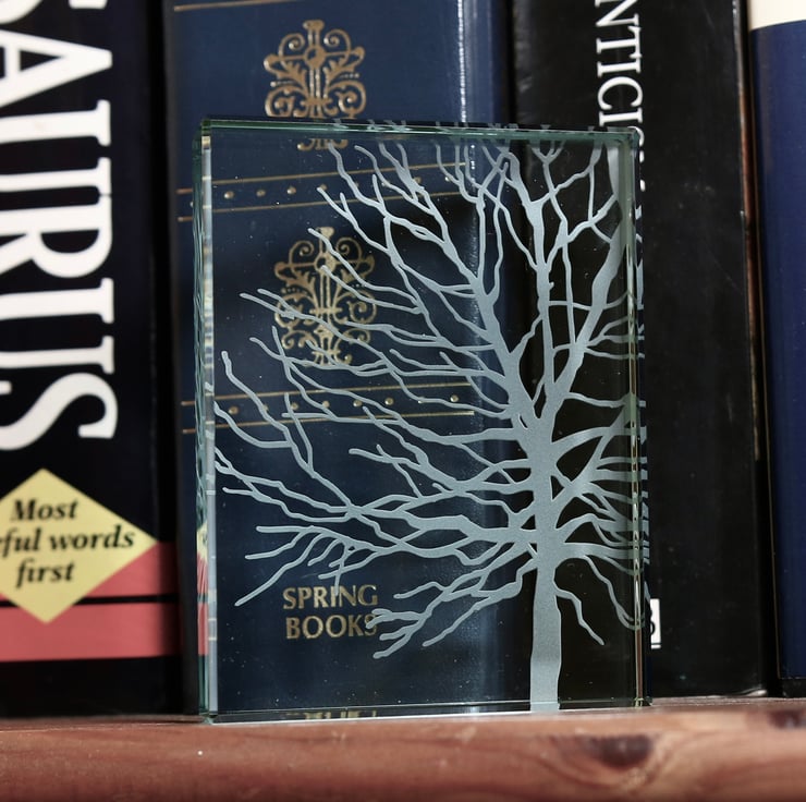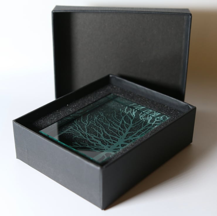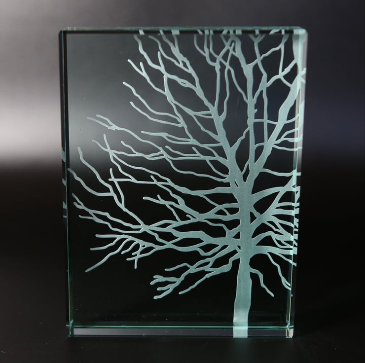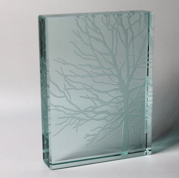 This glass block is sandblasted with a beautiful silhouette of a tree in winter. The depth of the etching brings the light into the block creating a stunning effect and giving this little sculpture life.