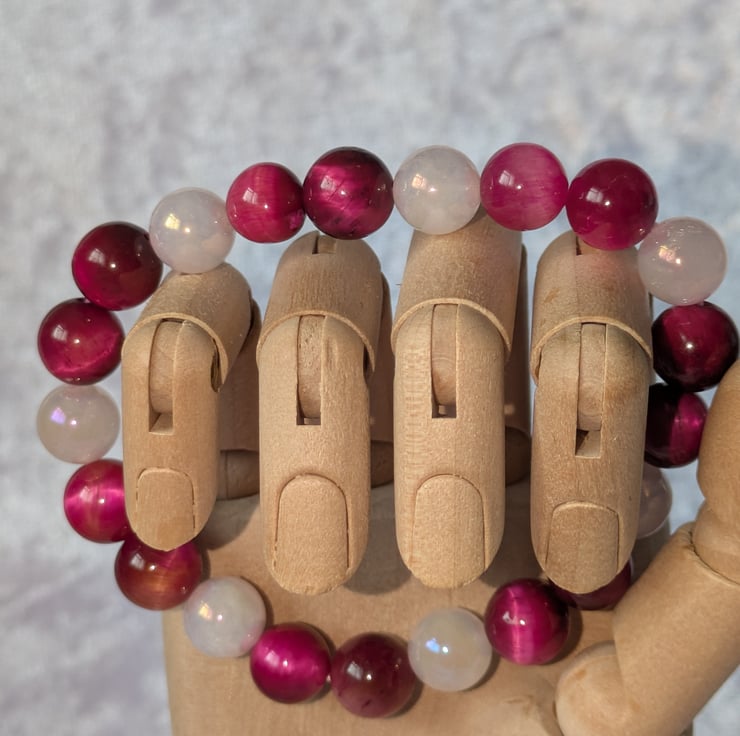 Beautiful and vibrant pink tigers eye crystals are combined with pink aura beads to make this lovely bracelet. Pink tigers eye is believed to enhance compassion and confidence and promote balance.