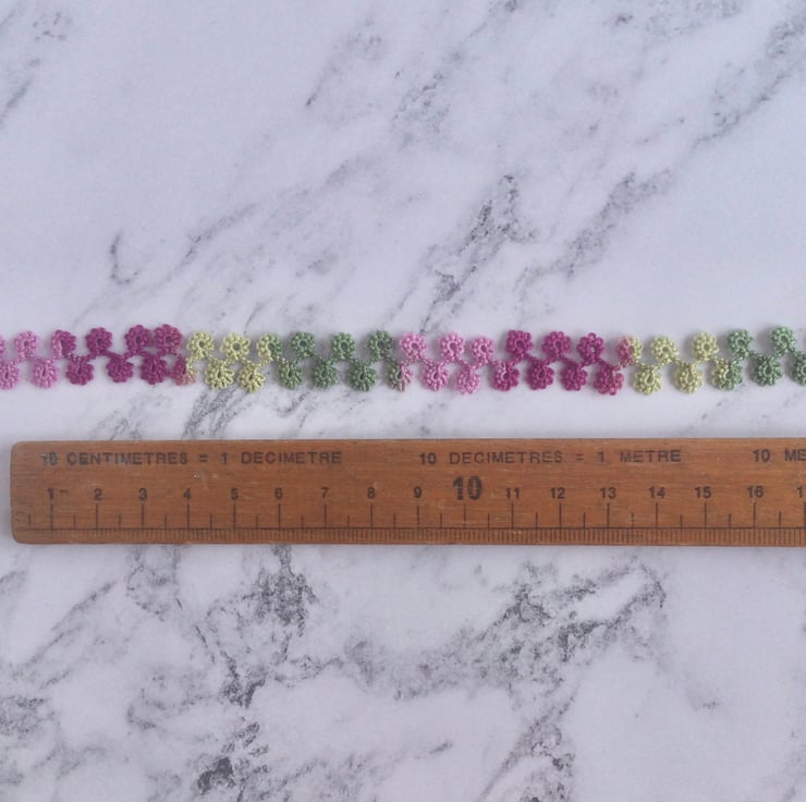 This trim is carefully shuttle tatted in high quality cotton thread.