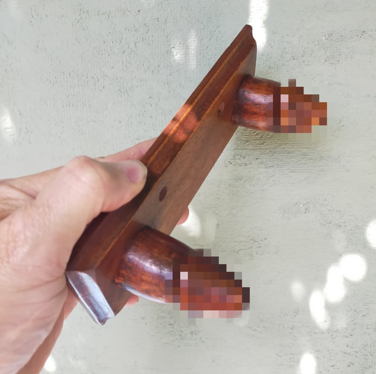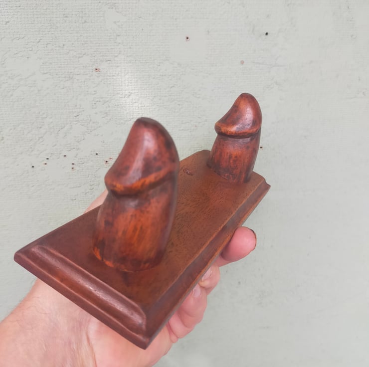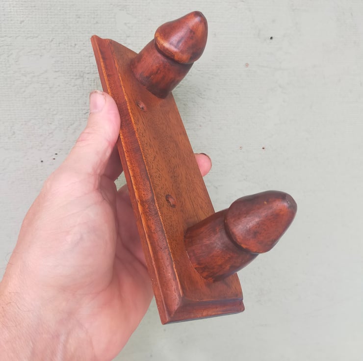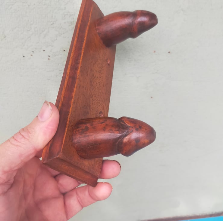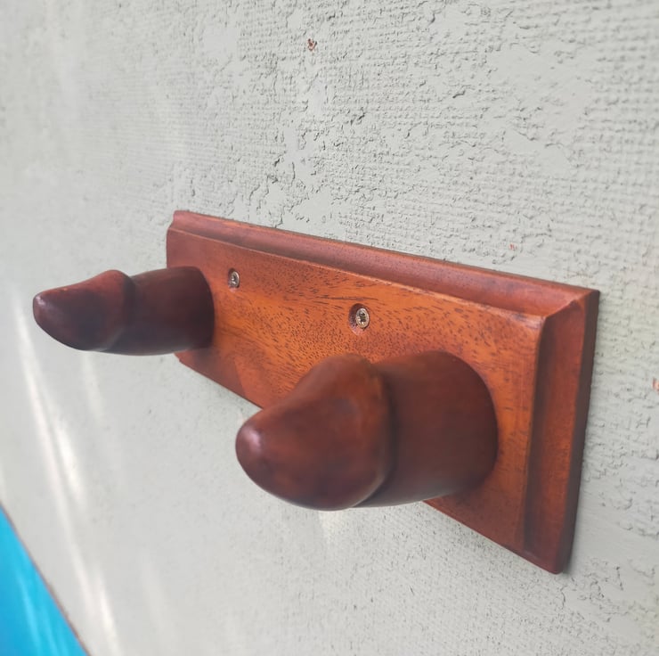 Want something a little more interesting to hang your dressing gown, bath robe or towel on? My novel hooks are designed for the bedroom or bathroom door of the more adventurous. Each appendage is individually hand-carved from reclaimed mahogany, sanded, stained, polished and waxed, and firmly screwed and glued to a mahogany backplate. The backplates are all different sizes as I have had to cut around the many nail holes in the original timber, so please do check dimensions carefully.The entire range of Choads, Packets, Stiffies and Shrooms is hand-carved from Brazilian mahogany - now a rare and protected timber - but reclaimed from a farm near Clitheroe, built in the 1950s. This timber served its purpose as the rafters of a barn, but is now living again as a limited run of cheeky household sculptures. As can be seen from the reverse pics, the timber is a light reddish brown but I wanted to create a darker and more distressed patina: I wanted these pieces to look like they had been recovered from an abandoned Victorian molly house. None is perfect: all have some flaw or other, and I have tried to highlight those in the photos. After all, if they were all identical how could you have a favourite? Each of this limited run has been named, numbered and signed by myself to make them even more unique.