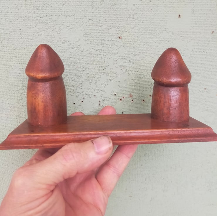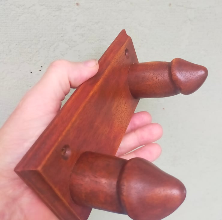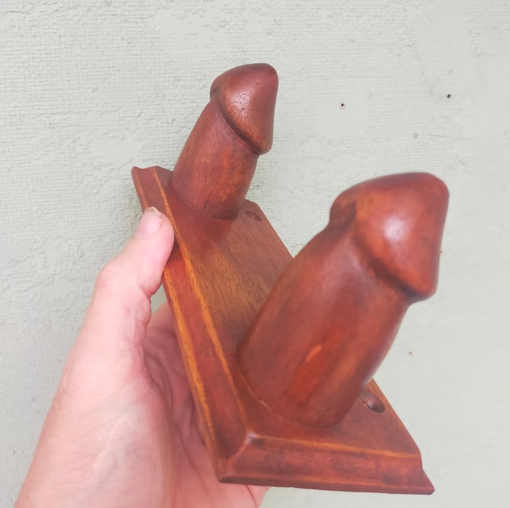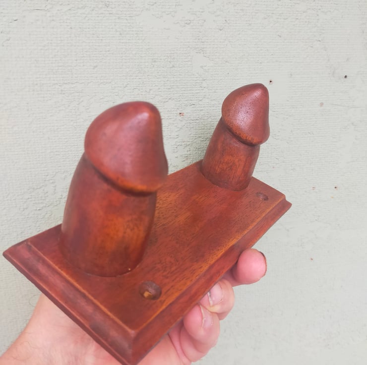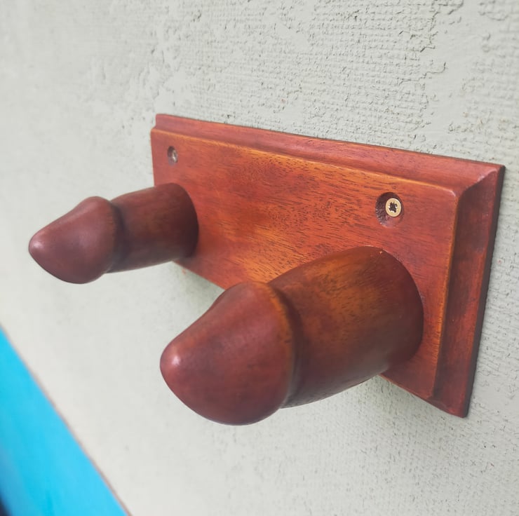 Want something a little more interesting to hang your dressing gown, bath robe or towel on? My novel hooks are designed for the bedroom or bathroom door of the more adventurous. Each appendage is individually hand-carved from reclaimed mahogany, sanded, stained, polished and waxed, and firmly screwed and glued to a mahogany backplate. The backplates are all different sizes as I have had to cut around the many nail holes in the original timber, so please do check dimensions carefully.The entire range of Choads, Packets, Stiffies and Shrooms is hand-carved from Brazilian mahogany - now a rare and protected timber - but reclaimed from a farm near Clitheroe, built in the 1950s. This timber served its purpose as the rafters of a barn, but is now living again as a limited run of cheeky household sculptures. As can be seen from the reverse pics, the timber is a light reddish brown but I wanted to create a darker and more distressed patina: I wanted these pieces to look like they had been recovered from an abandoned Victorian molly house. None is perfect: all have some flaw or other, and I have tried to highlight those in the photos. After all, if they were all identical how could you have a favourite? Each of this limited run has been named, numbered and signed by myself to make them even more unique.