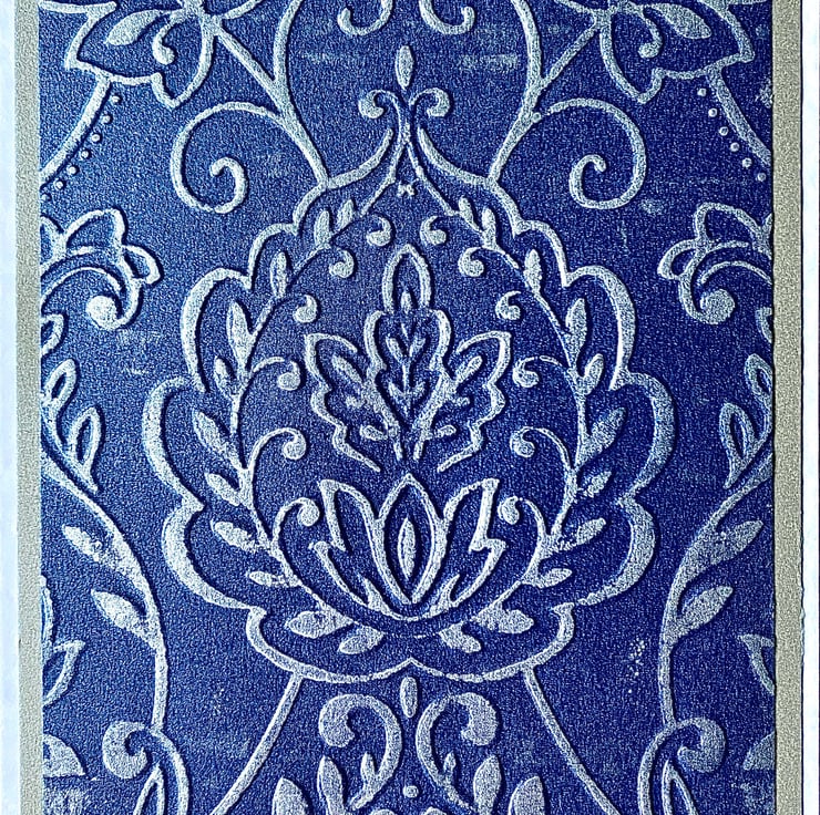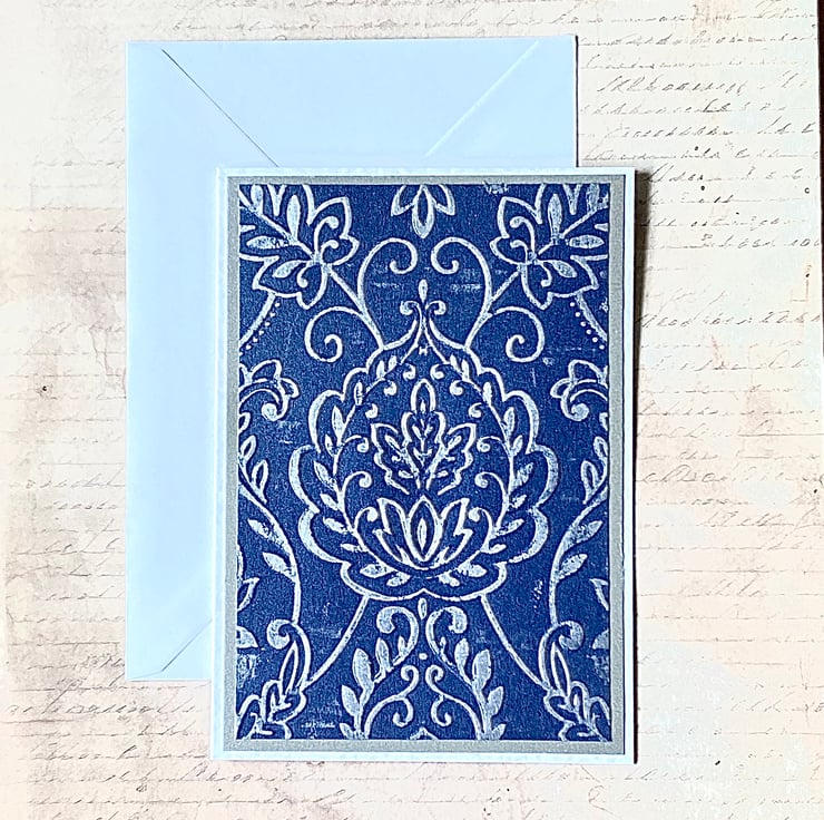 A striking handmade greeting card featuring an ornate damask-style design, hand-inked in silver on rich pearlescent indigo card and embossed for a luxurious, textured finish. The elegant silver detailing catches the light beautifully, making this card a timeless choice for a variety of occasions – from thank yous to birthdays, or simply to send a thoughtful note.
