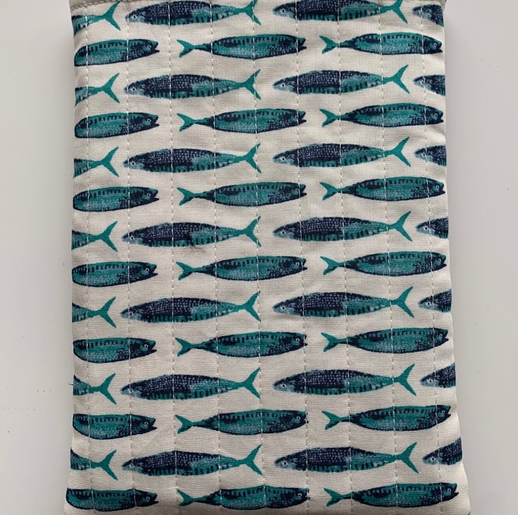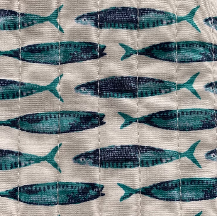 It is made in this striking cotton fabric featuring fish on a cream colour background.